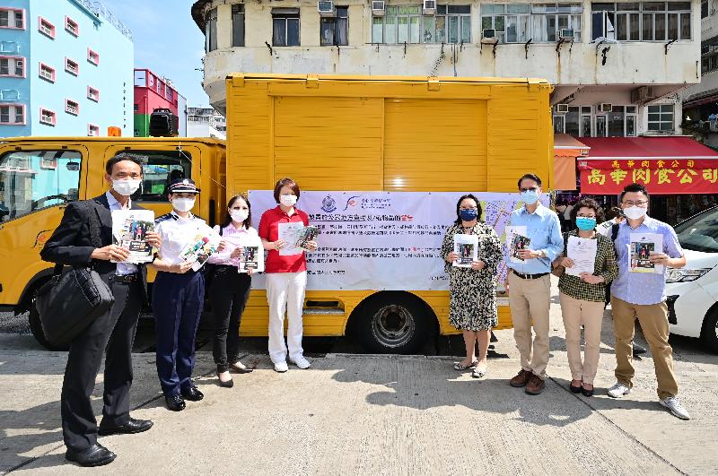 多个政府部门代表今日(九月十七日)在九龙城区进行公众教育和宣传,提醒店铺负责人和其他持份者切勿摆放货物或物品在公众地方或马路。图示食物环境卫生署(食环署)副署长黄淑娴(左三)、九龙城民政事务专员蔡敏君(右四)、食环署助理署长陈耀强(左一)、署理九龙城警区指挥官周虹(左二)、食环署统筹主管(小贩)特别职务劳月仪(右二)和该区区议员。