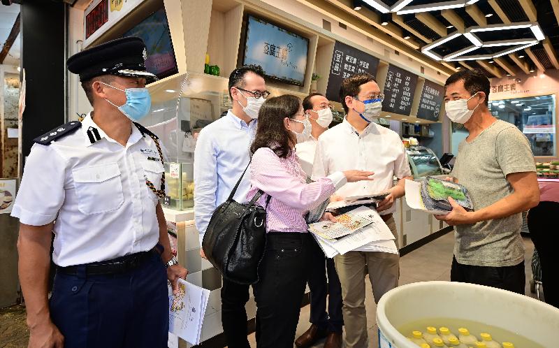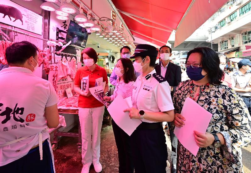 多个政府部门代表今日(九月十七日)在九龙城区进行公众教育和宣传,提醒店铺负责人和其他持份者切勿摆放货物或物品在公众地方或马路。图示食物环境卫生署副署长黄淑娴(左三)、九龙城民政事务专员蔡敏君(右一)和署理九龙城警区指挥官周虹(右二)联同该区区议员向店铺负责人派发通告。