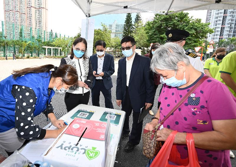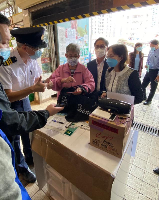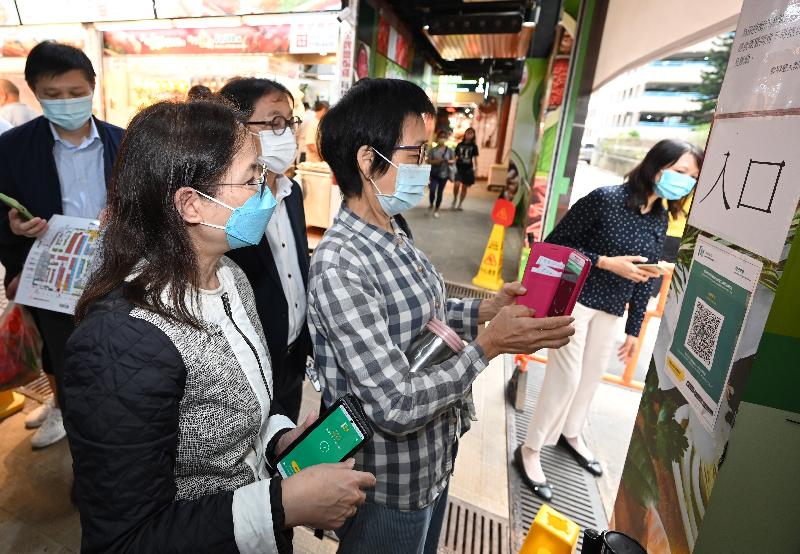 食物环境卫生署(食环署)今日(十一月一日)提醒巿民,进入食环署的办事处和室内设施(包括其辖下的公众街市、小贩市场及熟食市场)前,要先使用「安心出行」流动应用程式扫描「安心出行」场所二维码,方可入内,以配合政府最新的防疫措施。图示食环署副署长黄淑娴(左二)今早前往沙田大围街巿视察,了解巿民在新安排下进入公众街巿的情况,并为使用程式有困难的巿民提供协助。