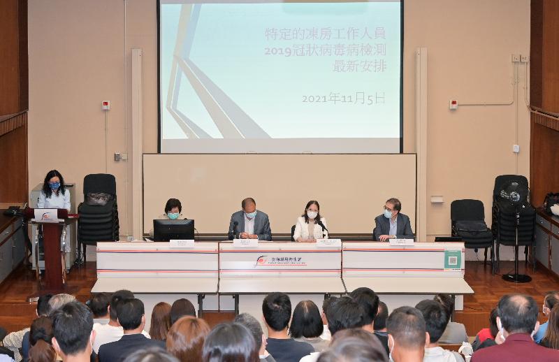 因应世界各地持续严峻的疫情,而变异病毒株传播力增强和传播速度更快,政府早前宣布会继续扩大及加强针对不同风险群组进行的大规模2019冠状病毒病检测。食物环境卫生署(食环署)今日(十一月五日)举行简介会,向冻房负责人及工作人员讲解适用于他们的最新检测安排。