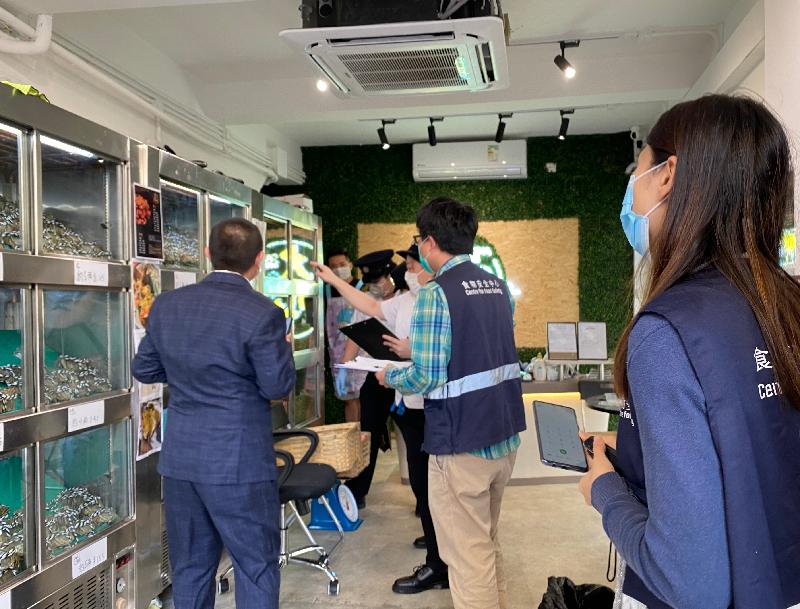 为保障食物安全,食物环境卫生署(食环署)过去一星期展开一连串突击行动,巡查各区大闸蟹销售处所,打击非法销售大闸蟹情况,以确保市面上出售的大闸蟹符合相关的法例规定。图示食环署人员在近日行动中巡视目标处所。