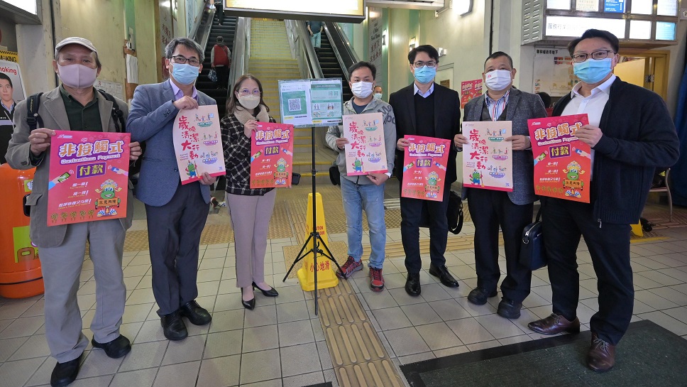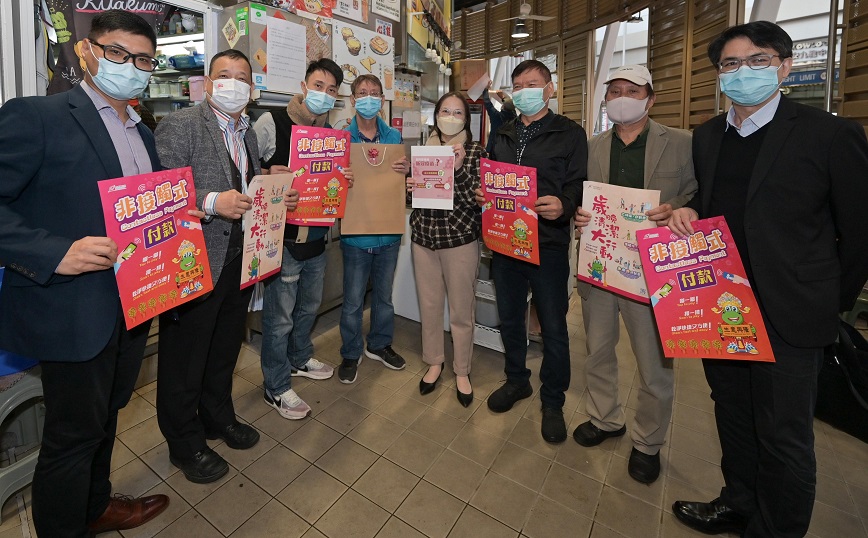 食环署管理人员今日下午前往粉岭联和墟街市熟食中心、油麻地吴松街临时熟食小贩市场及湾仔骆克道街市熟食中心,向档主派发清洁包及其他宣传品,提醒他们注意环境卫生,并呼籲他们使用非接触付款方式及踊跃接种疫苗,同心抗疫。