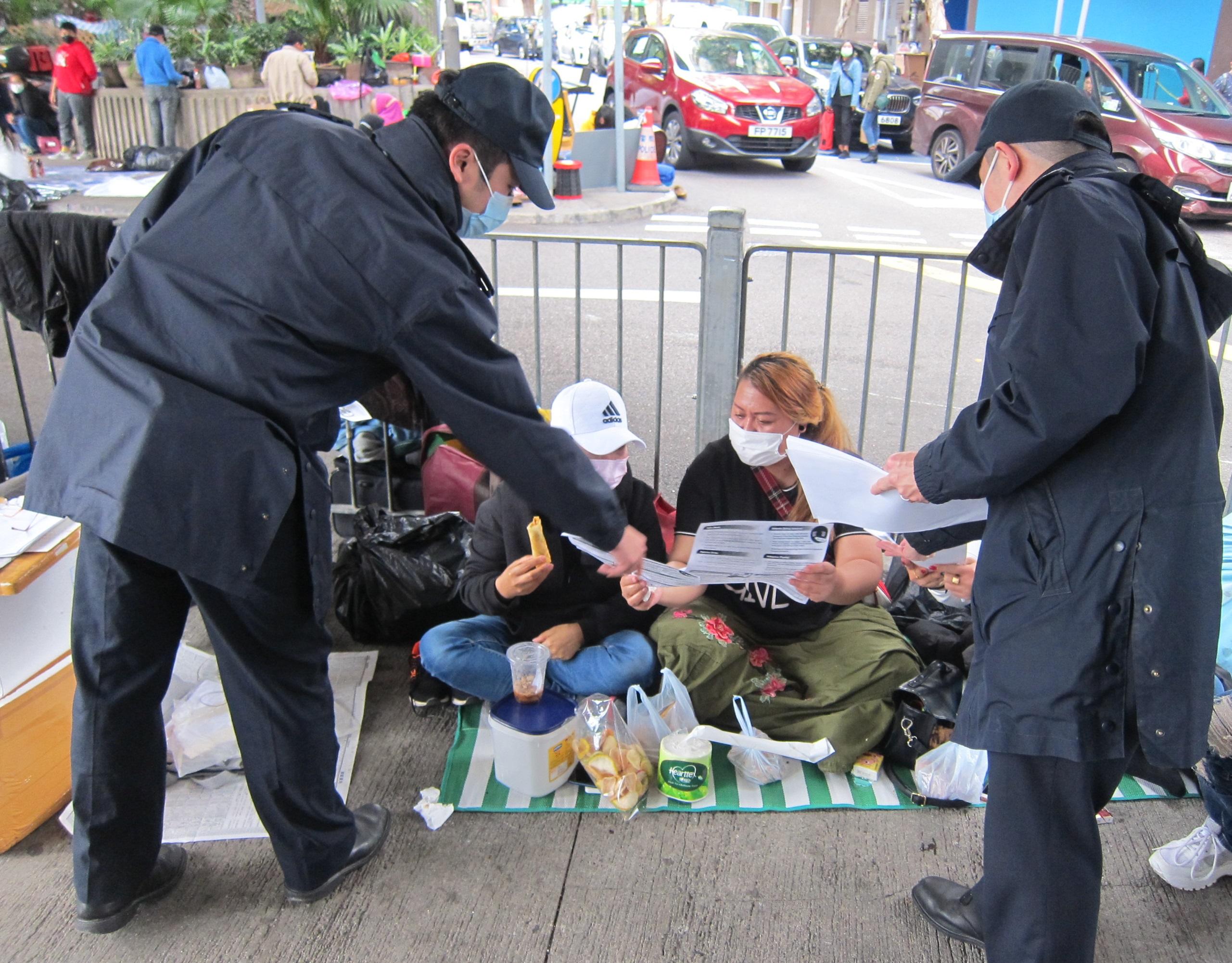 在过去两个周末,食物环境卫生署联同多个政府部门继续在多区外籍家庭佣工惯常聚集地点进行跨部门联合行动,进行宣传教育工作,呼籲他们提高防疫意识和遵守各项防疫规例及限制。