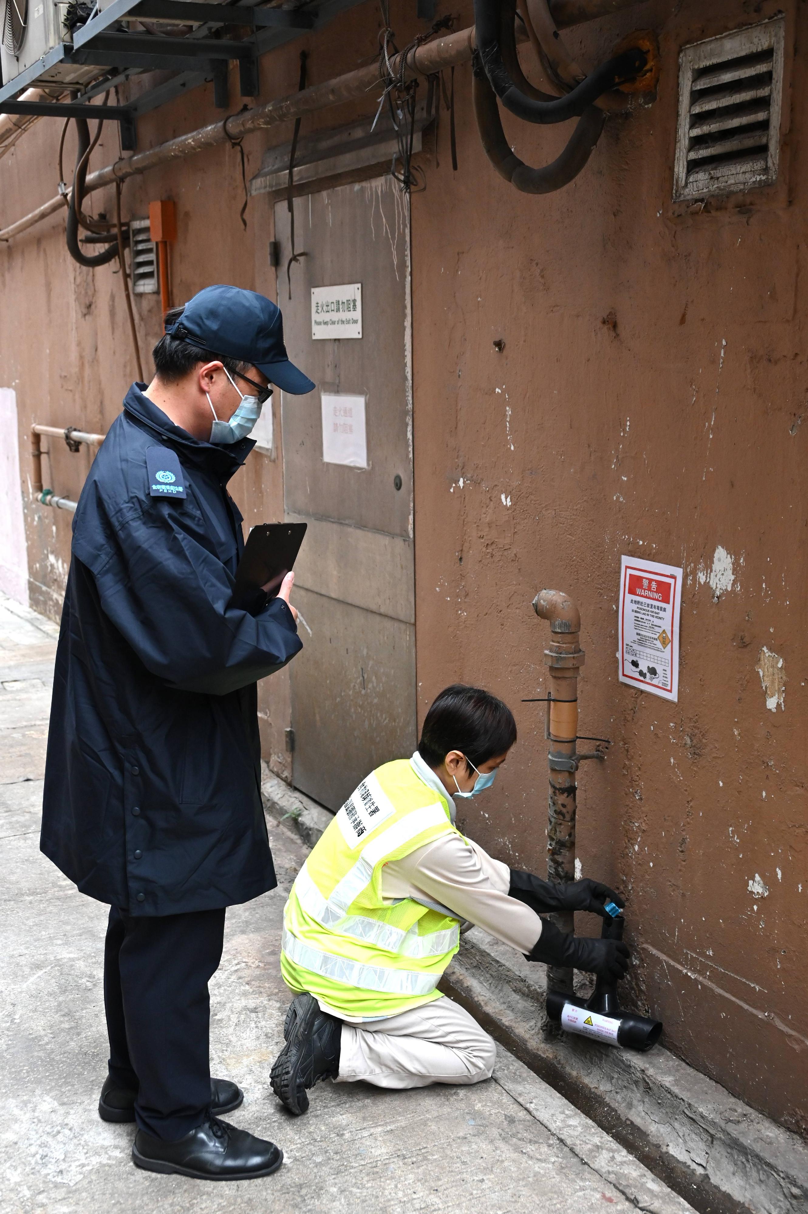 食物环境卫生署(食环署)发言人今日(一月二十七日)呼籲市民在岁晚及农历新年假期期间保持家居、社区及公众地方环境清洁卫生。食环署今年继续进行全港灭鼠运动。图示食环署人员及服务承办商于后巷放置鼠饵盒加强灭鼠。