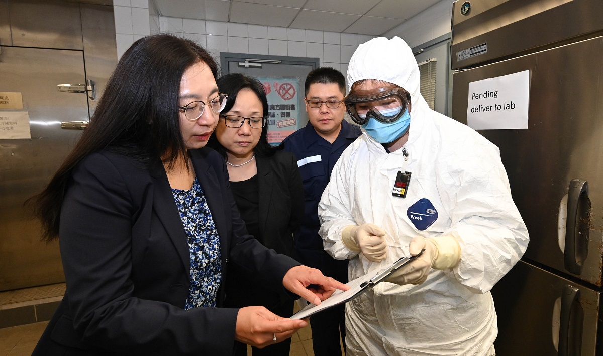 特区政府自八月二十四日起禁止源自日本十个都/县的水产品进口本港,食物环境卫生署(食环署)辖下食物安全中心(食安中心)亦于进口层面做好把关工作,加强对日本进口食品的检测。食环署署长杨碧筠(左一)今日(八月二十八日)在食物安全专员黄宏医生(左二)的陪同下,分别到机场货运站及食安中心机场食物检验办事处视察日本进口水产食品的清关及检测程序。