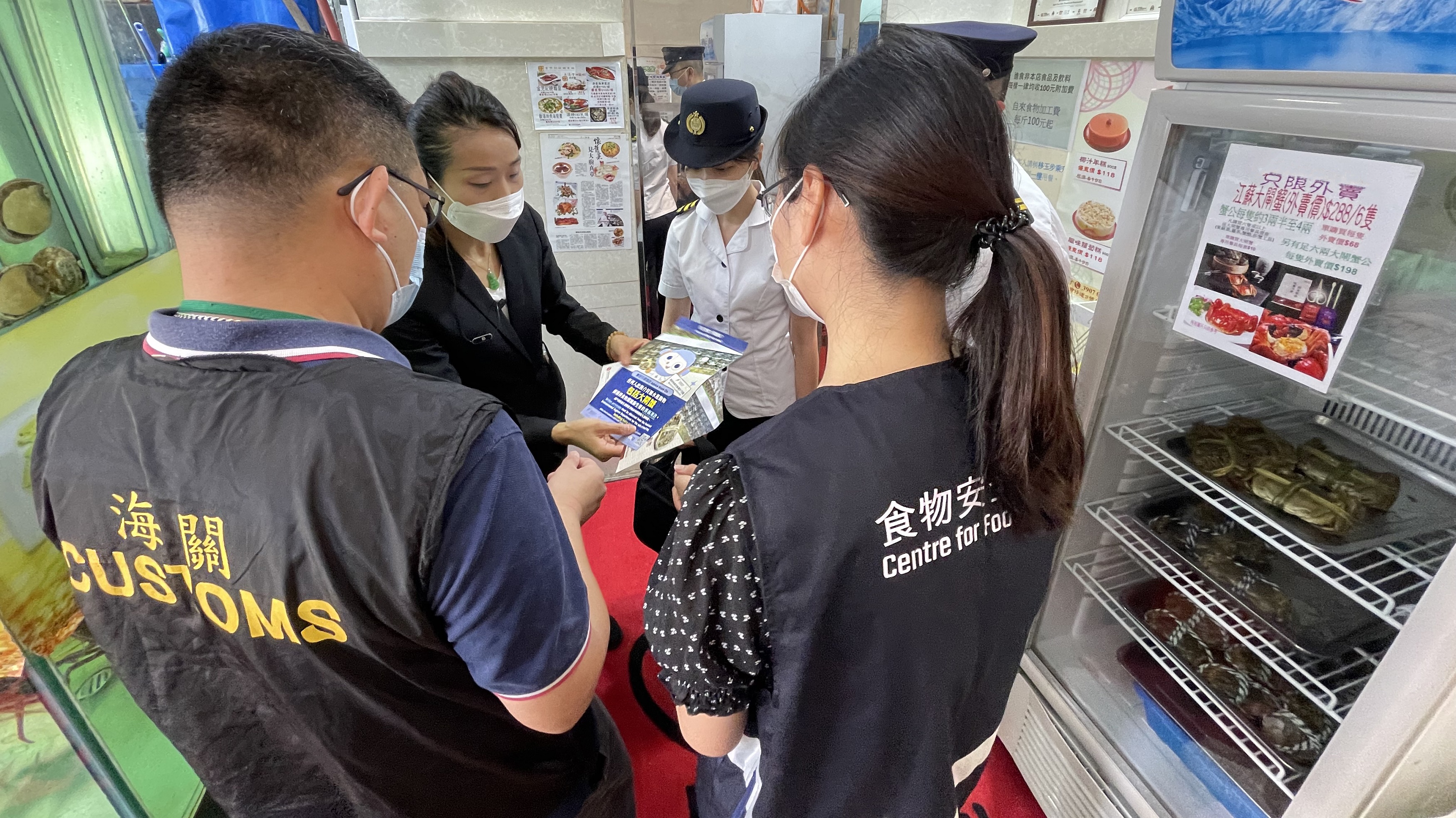 为保障食物安全,食物环境卫生署(食环署)与香港海关自十月二十五日起展开联合行动,突击巡查各区大闸蟹销售处所,打击非法销售大闸蟹的情况,以确保市面出售的大闸蟹符合相关法例规定。图示食环署和海关人员向处所负责人派发宣传单张。