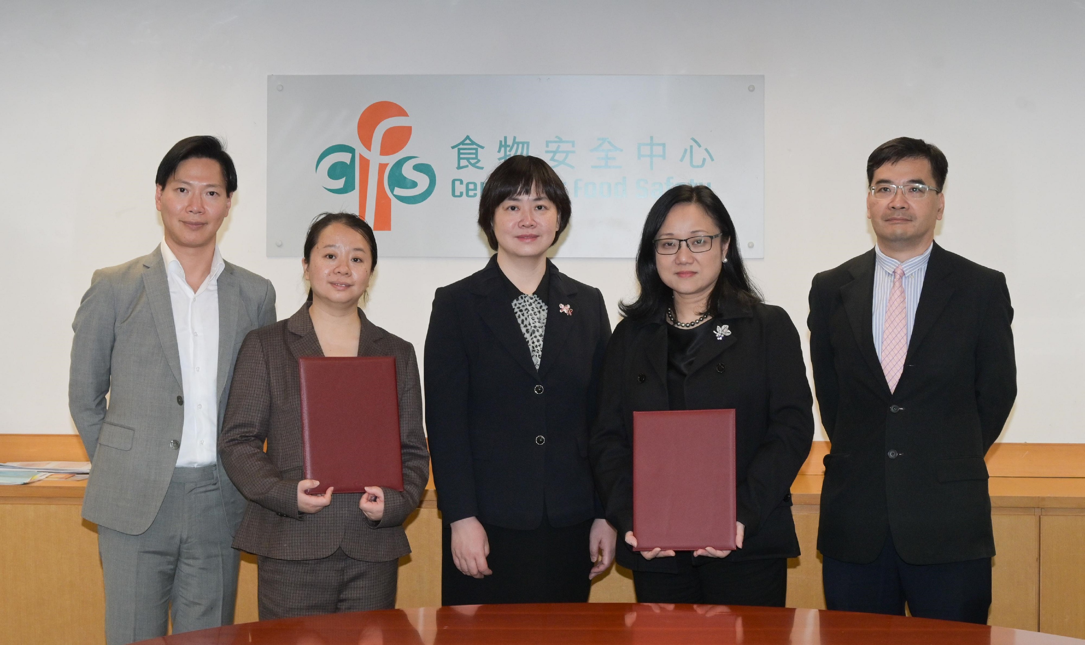 香港特别行政区政府食物环境卫生署食物安全中心(食安中心)与北京市食品检验研究院(北京市食品安全监控和风险评估中心)昨日(十一月二十九日)签署《京港食品安全保障技术合作协议》(《合作协议》)。图示(左起)食安中心助理署长(风险管理)李培文医生、北京市检验检测认证中心质量部部长毛婷、北京市市场监督管理局副局长唐云华、食物安全专员黄宏医生和食安中心署理顾问医生(社会医学)(风险评估及传达)周楚耀医生在签署《合作协议》后合照。