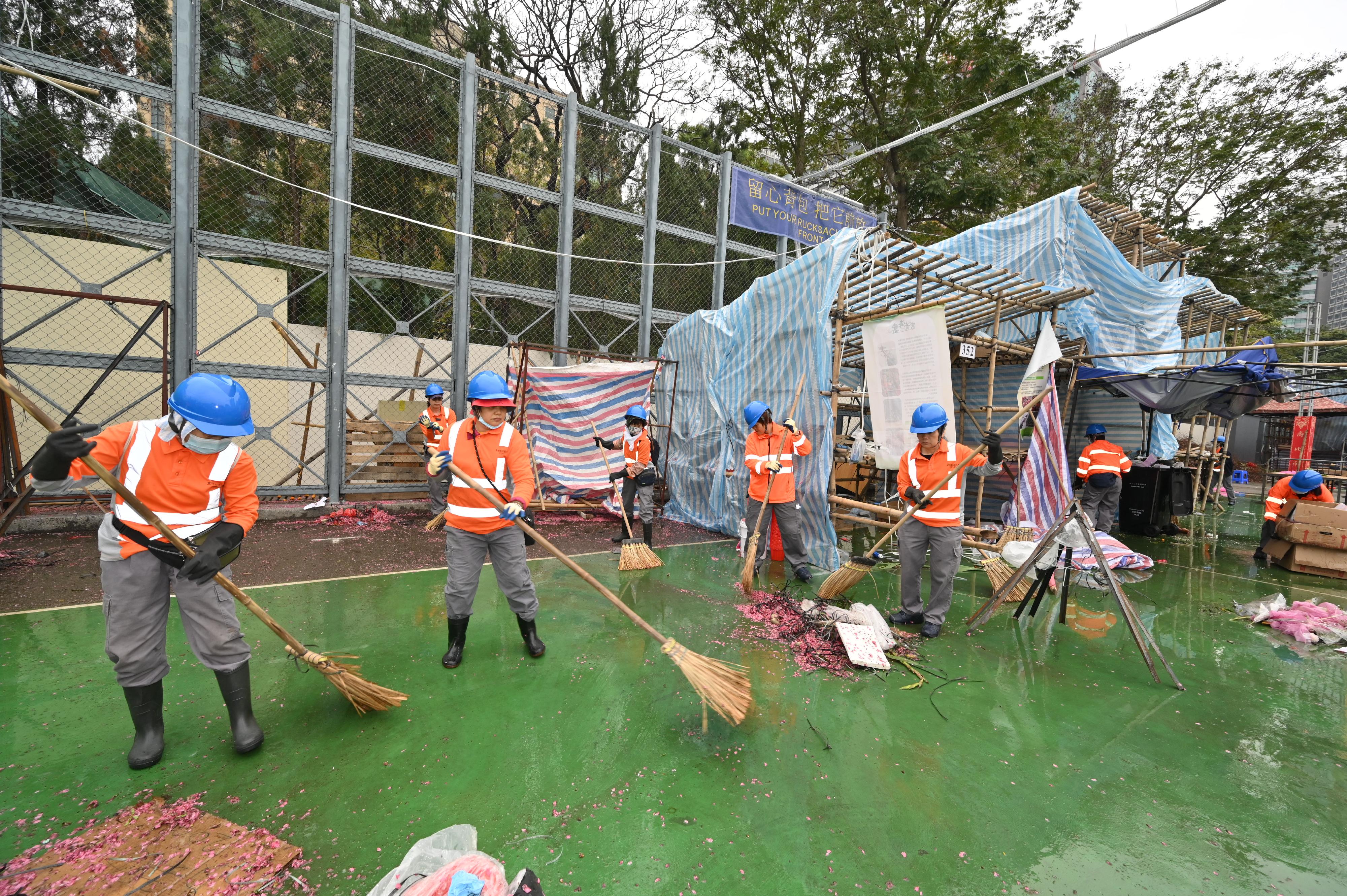 二○二四年农历年宵市场今日(二月十日)年初一清晨七时圆满结束。图示清洁工人在维多利亚公园年宵市场结束后清理场地。