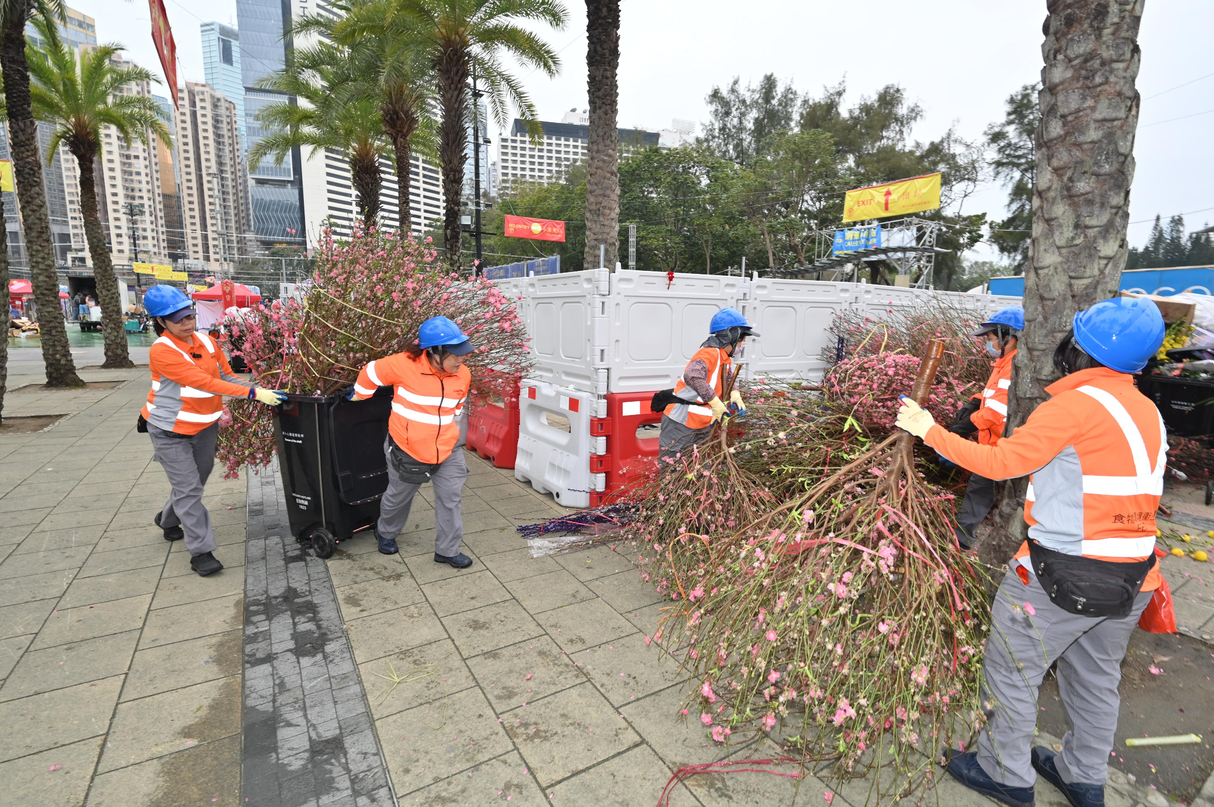 随着年宵市场圆满结束,食环署动员228名员工及调动50架次垃圾收集车和水车为维多利亚公园年宵市场进行清理工作,其余十四个年宵市场清理工作则由外判洁淨服务承办商负责。所有年宵市场的清理工作约于下午七时完成,经彻底清洗后,场地已回复清洁原貌。