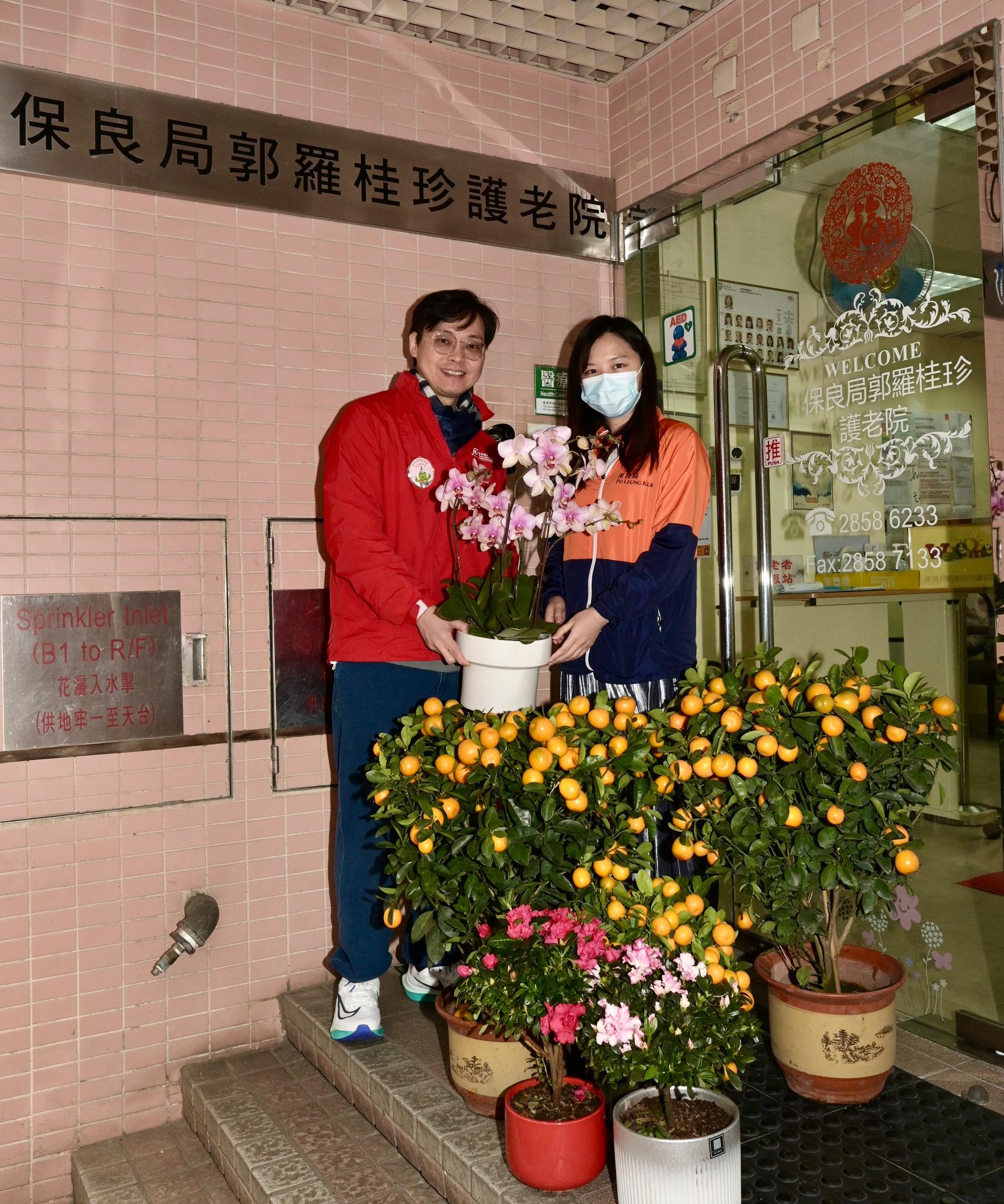 二○二四年农历年宵市场今日(二月十日)年初一清晨七时圆满结束。食物环境卫生署员工组成的义工队协助部门把花档档主自愿送赠未售出的花卉和盆栽转赠予安老院/残疾人士院舍和公立医院。图示义工队成员将年花转赠予一所安老院的代表。