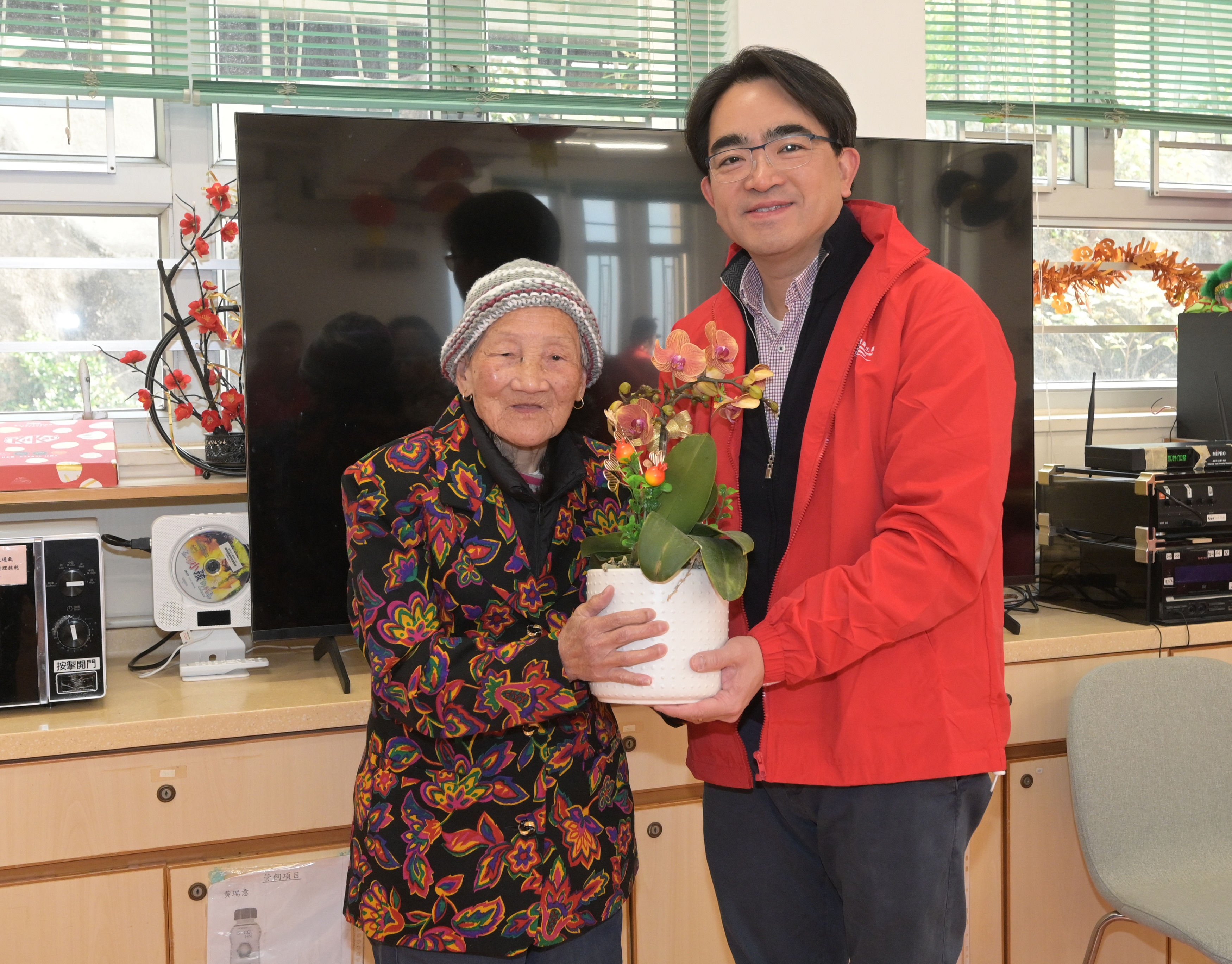 二○二五年农历年宵市场今日(一月二十九日)年初一清晨七时圆满结束。食物环境卫生署(食环署)员工组成的义工队协助部门把花档档主自愿送赠未售出的花卉和盆栽转赠予安老院/残疾人士院舍和公立医院。图示食环署署长吴文杰将年花转赠予一位安老院长者。