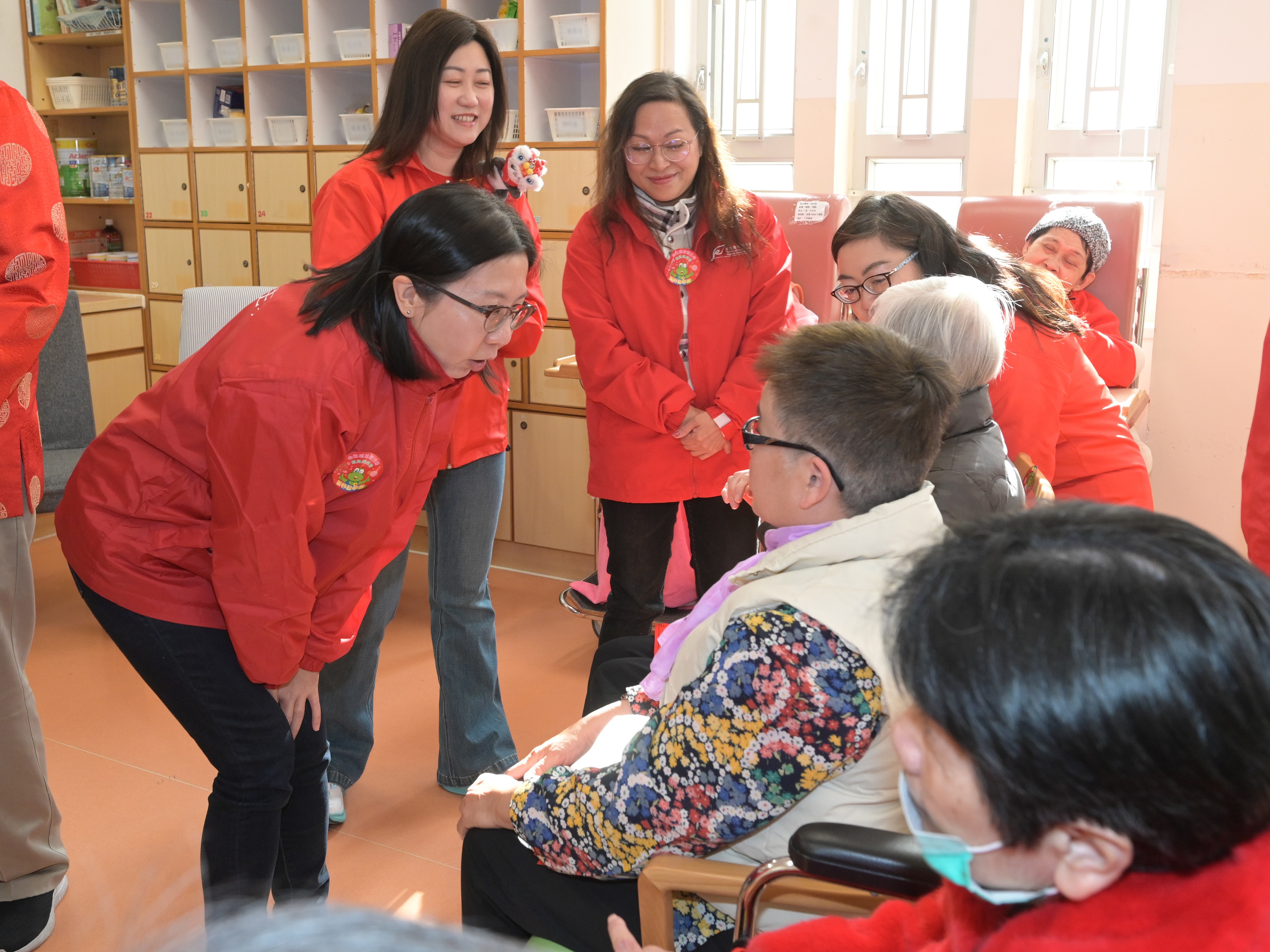 二○二五年农历年宵市场今日(一月二十九日)年初一清晨七时圆满结束。食物环境卫生署员工组成的义工队协助部门把花档档主自愿送赠未售出的花卉和盆栽转赠予安老院/残疾人士院舍和公立医院。图示义工队成员向一所安老院的长者送上新年祝福。