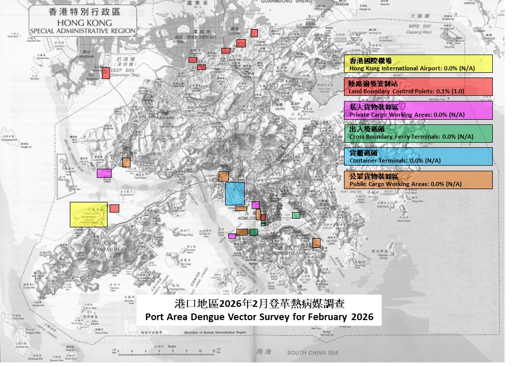 二零二六年二月份的港口每月白纹伊蚊诱蚊器指数为0.02%,港口每月白纹伊蚊密度指数为1.0。
