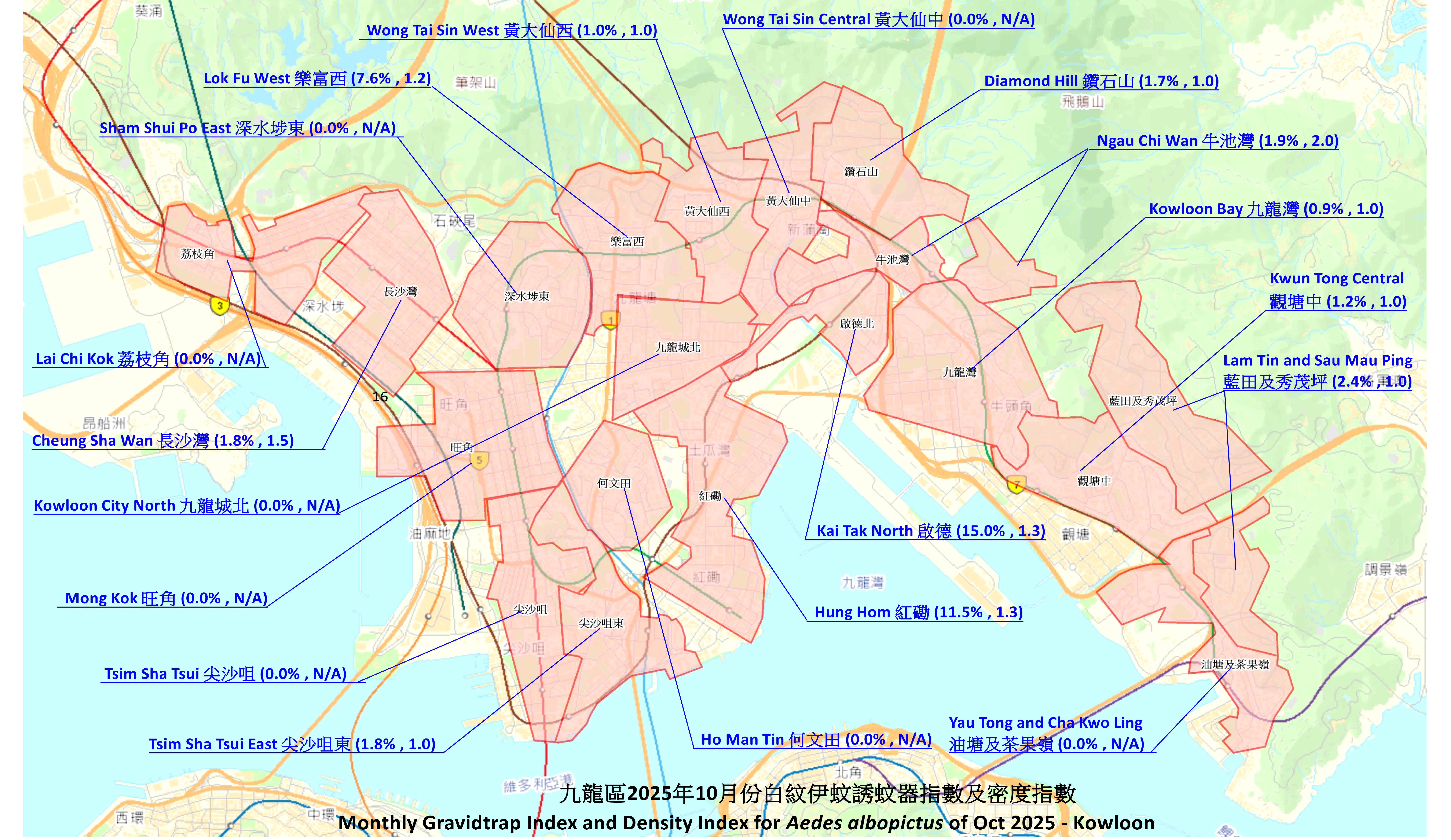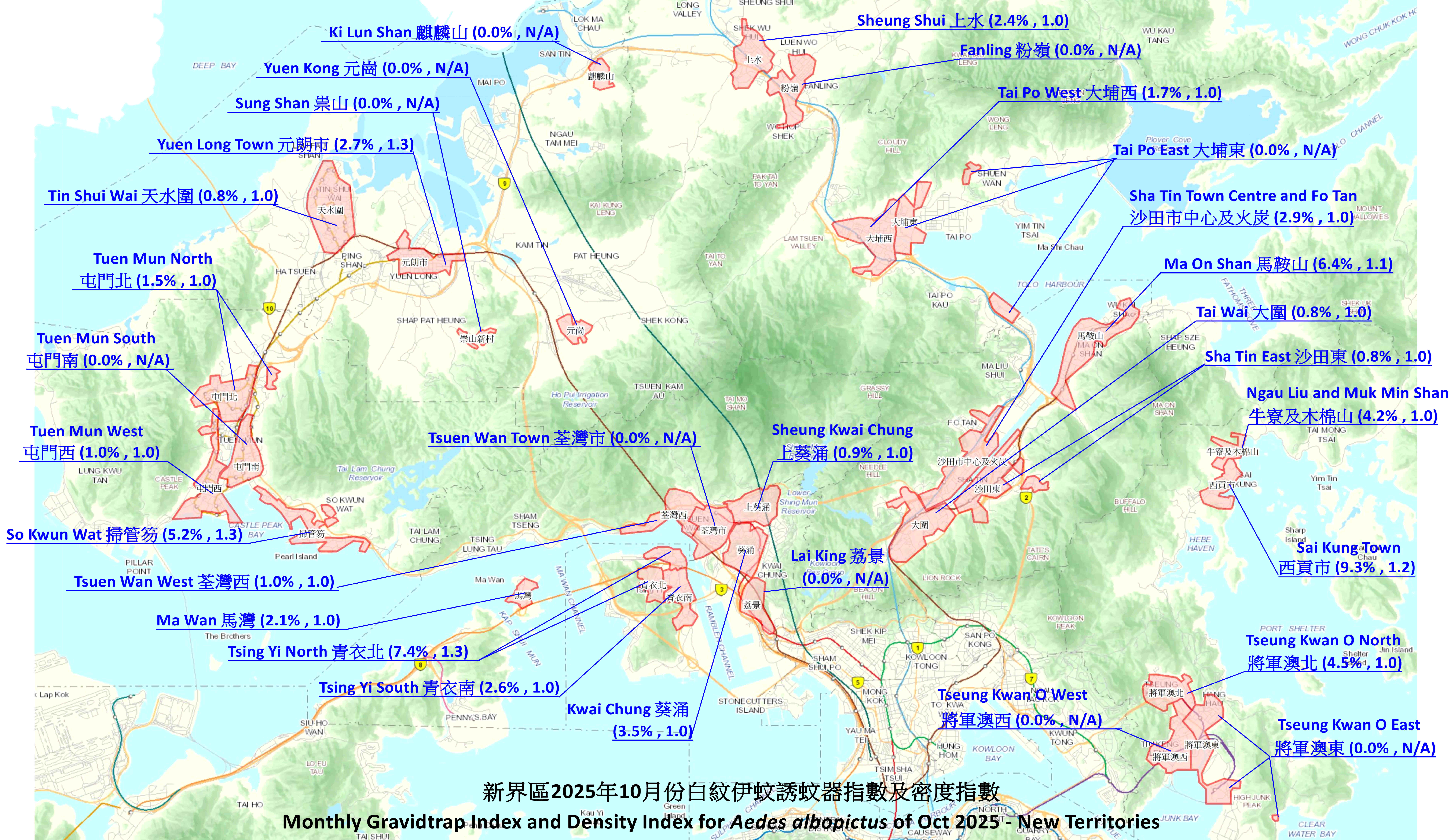 二零二五年六十四个监察地区的分区白纹伊蚊诱蚊器指数及分区白纹伊蚊密度指数载列如下: