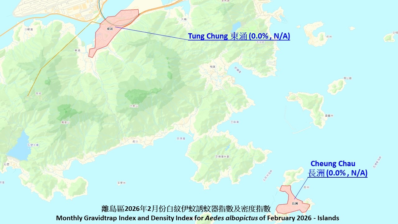 二零二六年六十二个监察地区的分区白纹伊蚊诱蚊器指数及分区白纹伊蚊密度指数载列如下: