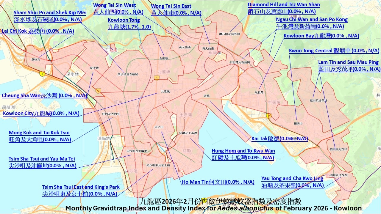| 红磡及土瓜湾 | 分区诱蚊器指数 | 1.8 | 0.0 | |||||||||||
