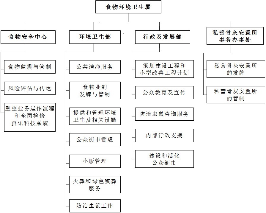 本署的服务由食物安全中心、环境卫生部、行政及发展部和私营骨灰安置所事务办事处提供(架构图如下)。本署的部分运作或会对环境造成影响,有关概况将于下文叙述。