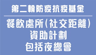 餐飲處所(社交距離)資助計劃為有關餐飲業界提供財政紓困措施,預期可惠及約16 000間餐飲業處所及其員工。計劃為合資格並營運中的普通食肆、小食食肆、水上食肆及工廠食堂的持牌人按其處所樓面面積發放25萬元至220萬元資助,主要用作支援在其申請獲批後的六個月內支付員工薪酬。為向飲食業界別提供即時紓困援助,有關資助會透過兩筆付款預先分發。