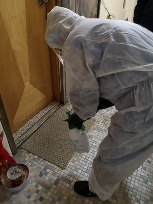 曾經試過有某個單位已截斷水電供應,消毒工作需要在沒有電燈照明及帶備清潔用水的情況下進行。食環署人員只能依靠單位內的日光進行,除了要加倍留意單位內的環境,更要確保清潔和消毒程序一絲不苟;有單位正進行裝修,內部擺放的用品較為混亂,加上沒有電燈照明,食環署人員步步為營之餘,更須謹慎處理消毒工作的每個步驟和細節。完成消毒工作後,食環署人員需按照卸除及棄置保護裝備的程序,一步一步地卸除和妥善處理卸下的保護物品,以減低自身受感染及病菌傳播的風險。食環署的人員不分晝夜、爭分奪秒地工作。面對着一個又一個的挑戰及外在潛藏風險的情況下,他們仍然緊守崗位、不畏艱難;在行動中團結一致,互相幫忙,互相提點,務求迅速有效地完成所有消毒工作,希望讓受影響的住戶得以盡快回家,讓附近的居民在疫情的陰霾下得以安心。