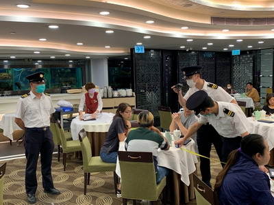 食環署緊密配合特區政府就《預防及控制疾病條例》(《規例》)(第599章)下的最新法例修訂,環境衞生組和小販及街市組人員致力加強教育宣傳、巡查並嚴厲執法,確保食肆、表列處所如商營浴室和公眾娛樂場所等、食環署街市、固定排檔的相關人士和市民嚴格遵從有關規定,以減低病毒傳播的風險。在其中一次行動中,衞生督察留意到一間酒樓貴賓房內有兩枱客人共約二十多人,涉嫌違反當時每枱不可多於四人的規定。立即向同事匯報。在評估情況後,地區衞生辦事處立刻調動人手,另一方面聯繫警方立即展開聯合行動。由於涉案人數眾多,而且部分人士情緒激動,甚至作出挑釁行為,執法行動遇到很大阻力。食環署的執法人員保持冷靜和表現專業,向違例者詳細解釋條例內容,並說明若不遵從獲授權人員的要求而拒絕出示身分證明文件將可能違反的法律條例和罰則。經過兩個多小時的耐心解釋,最終成功向多名違例者發出定額罰款通知書及向事涉食肆負責人提出檢控。