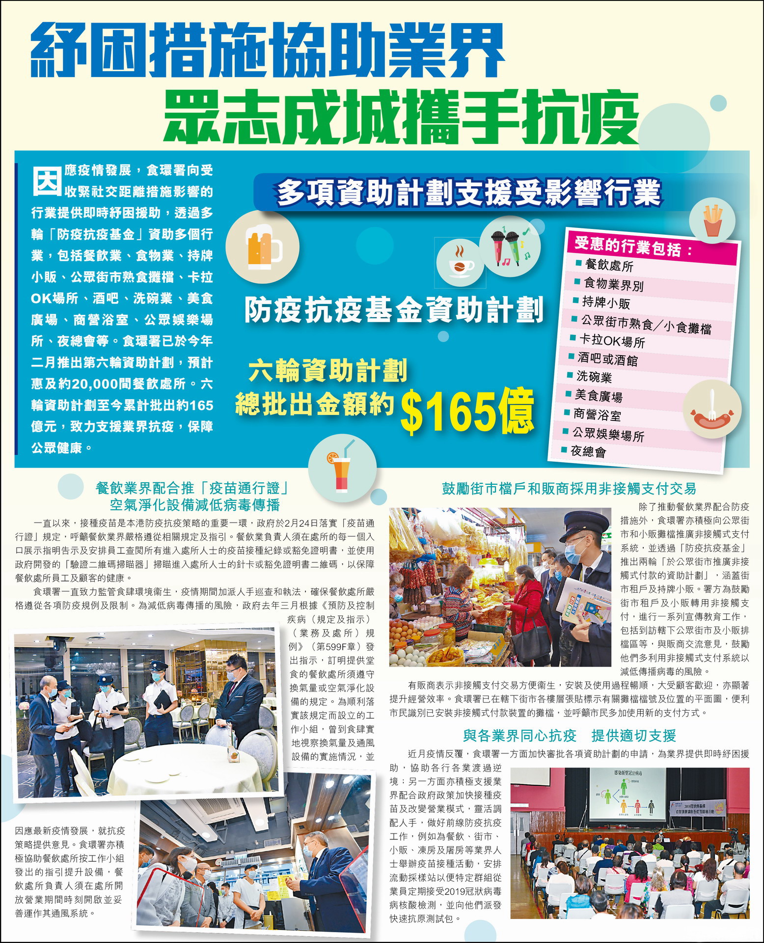 因應疫情發展,食環署向受收緊社交距離措施影響的行業提供即時紓困援助,透過多輪「防疫抗疫基金」資助多個行業,包括餐飲業、食物業、持牌小販、公眾街市熟食攤檔、卡拉OK場所、酒吧、洗碗業、美食廣場、商營浴室、公眾娛樂場所、夜總會等。食環署已於今年二月推出第六輪資助計劃,預計惠及約20,000間餐飲處所。六輪資助計劃至今累計批出約165億元,致力支援業界抗疫,保障公眾健康。