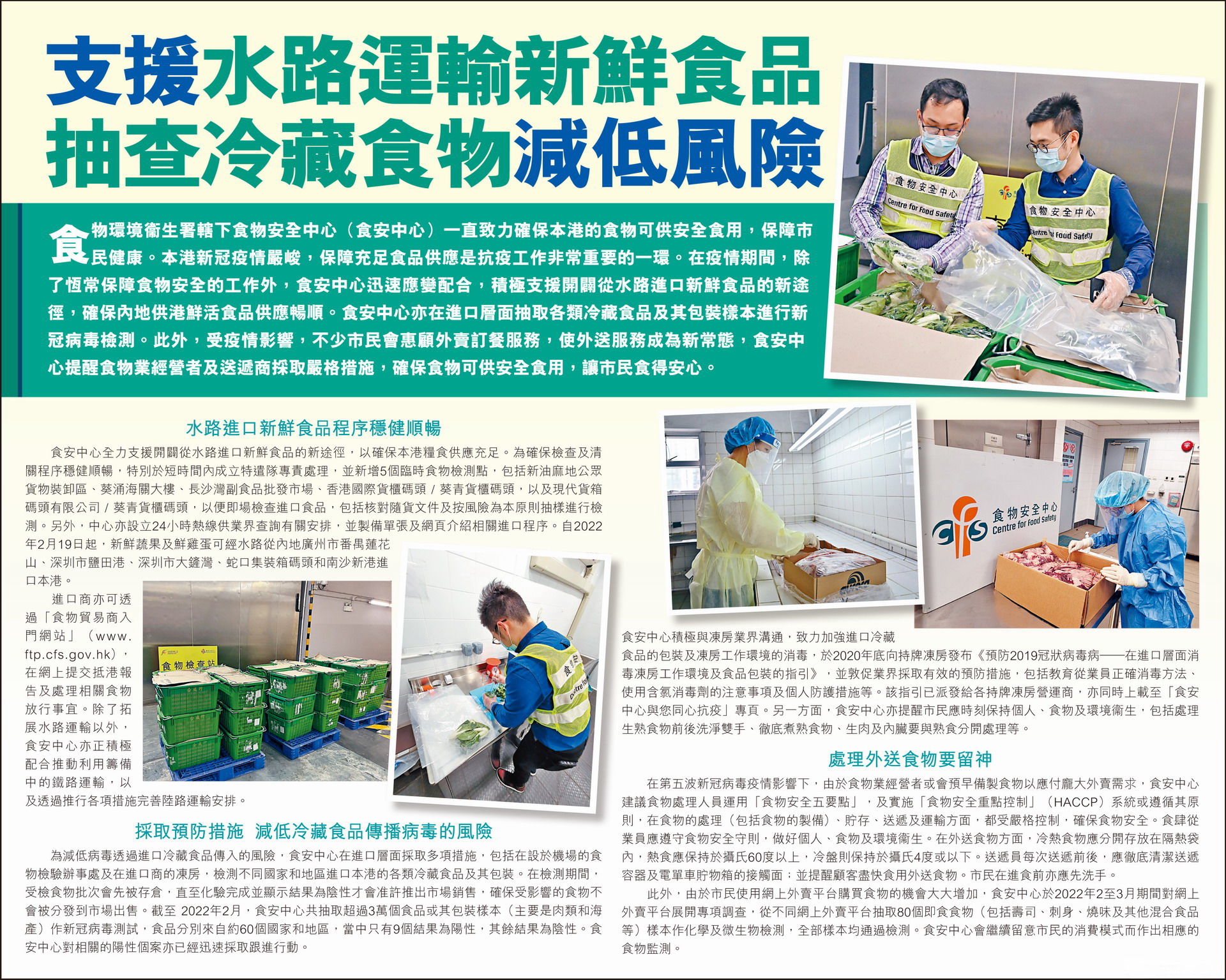 食物環境衞生署轄下食物安全中心(食安中心)一直致力確保本港的食物可供安全食用,保障市民健康。本港新冠疫情嚴峻,保障充足食品供應是抗疫工作非常重要的一環。在疫情期間,除了恆常保障食物安全的工作外,食安中心迅速應變配合,積極支援開闢從水路進口新鮮食品的新途徑,確保內地供港鮮活食品供應暢順。食安中心亦在進口層面抽取各類冷藏食品及其包裝樣本進行新冠病毒檢測。此外,受疫情影響,不少市民會惠顧外賣訂餐服務,使外送服務成為新常態,食安中心提醒食物業經營者及送遞商採取嚴格措施,確保食物可供安全食用,讓巿民食得安心。
