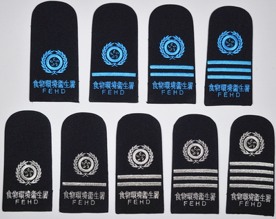 食物環境衞生署約三千名小販管理主任及管工職系人員,將由星期一(五月七日)起穿上新的夏季制服以新面貌為市民服務。圖示小販管理主任及管工職系各級人員的新肩章,上排左起為管工、高級管工、巡察員及高級巡察員的肩章,下排左起為助理小販管理主任、小販管理主任、高級小販管理主任、總小販管理主任及首席小販管理主任的肩章。