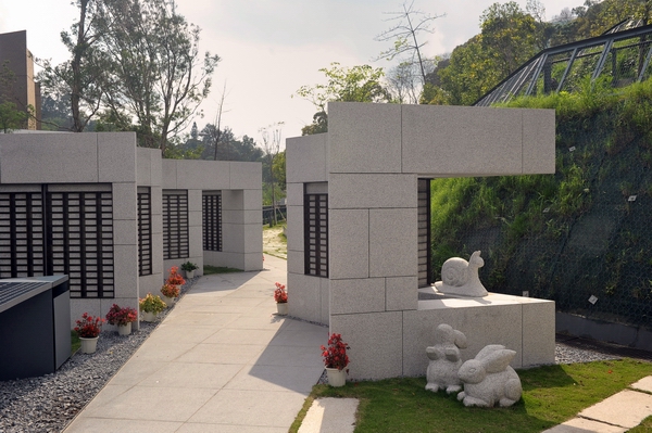 食物環境衞生署(食環署)和合石橋頭路靈灰安置所第五期西式紀念花園工程已經完成。圖示西翼紀念花園內的動物石雕和主題碑牆。
