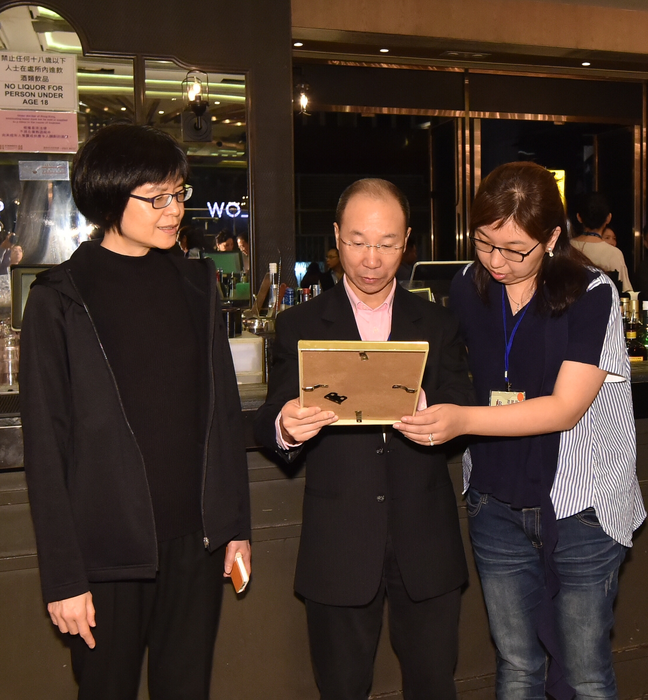 酒牌局成員今日(十一月十八日)凌晨在主席黃江天博士率領下,前往中區和旺角區多間領有酒牌的處所,實地了解該等處所的經營情況及警務處的執法行動。圖示黃江天博士(中)、酒牌局副主席范翠華(右)及食物環境衞生署署長劉利群(左)細看中區一家持酒牌處所的牌照。