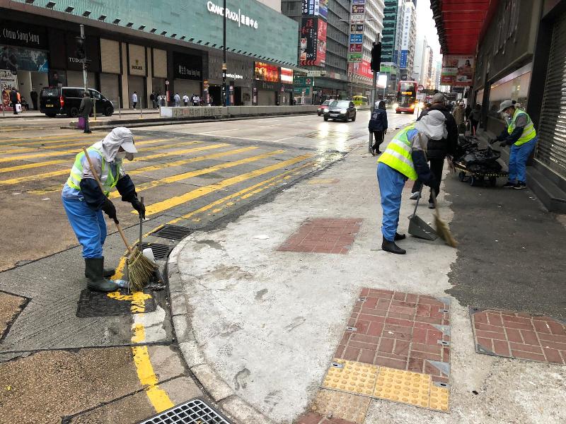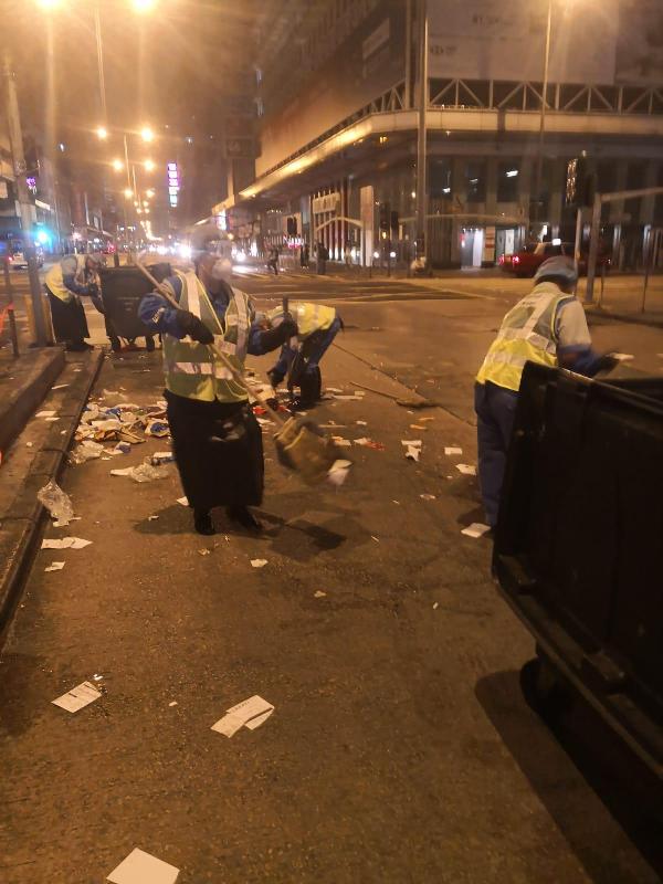 圖示食物環境衞生署外判潔淨服務承辦商工人今早(十二月十六日)在旺角區大型人群活動後清掃街道。