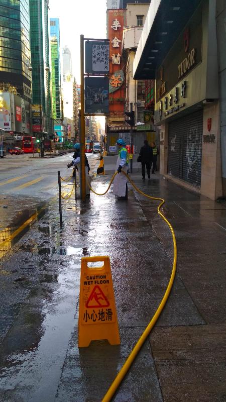 圖示食物環境衞生署外判潔淨服務承辦商工人今早(十二月十六日)在旺角區大型人群活動後進行街道清洗工作。