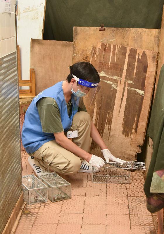 食物環境衞生署(食環署)今日(八月二十二日)表示,已在轄下多個街市採取多項措施以加強清潔消毒等防疫工作,以及加強防治鼠患工作,確保街市環境清潔衞生。圖示食環署街巿服務承辦商於街市範圍放置捕鼠器加強滅鼠。