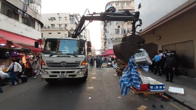 食物環境衞生署今日(一月三日)與警方分兩階段在深水埗福華街/北河街交界及大南街/南昌街交界一帶採取聯合行動,並就防疫規例及在公眾地方造成阻礙嚴厲執法。圖示兩個部門用夾車清理馬路上的貨品及雜物。