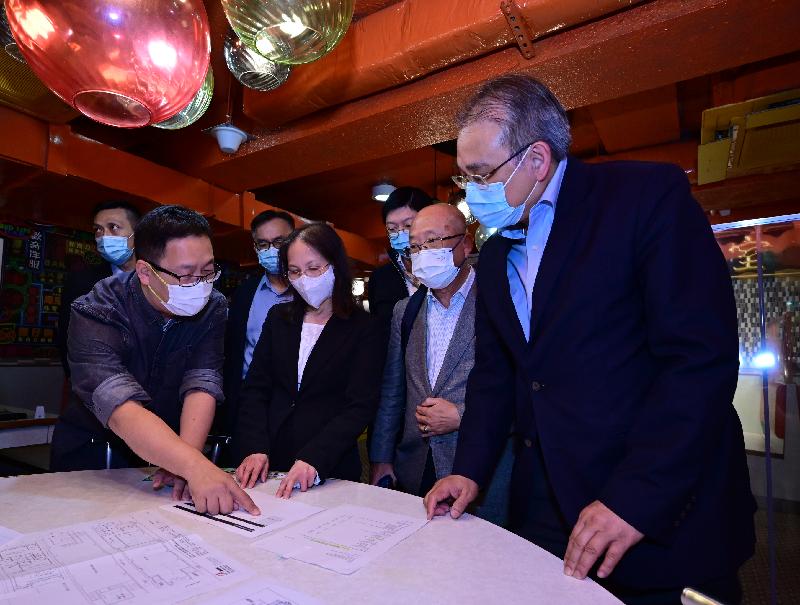 為順利落實提供堂食的餐飲處所在換氣量或空氣淨化設備方面須遵守的規定而成立的工作小組今日(四月二十日)聯同政府相關部門視察餐飲處所。圖示工作小組主席源柏樑教授(右一)和食物環境衞生署副署長黃淑嫻(左二)聽取餐廳負責人分享有關經驗。