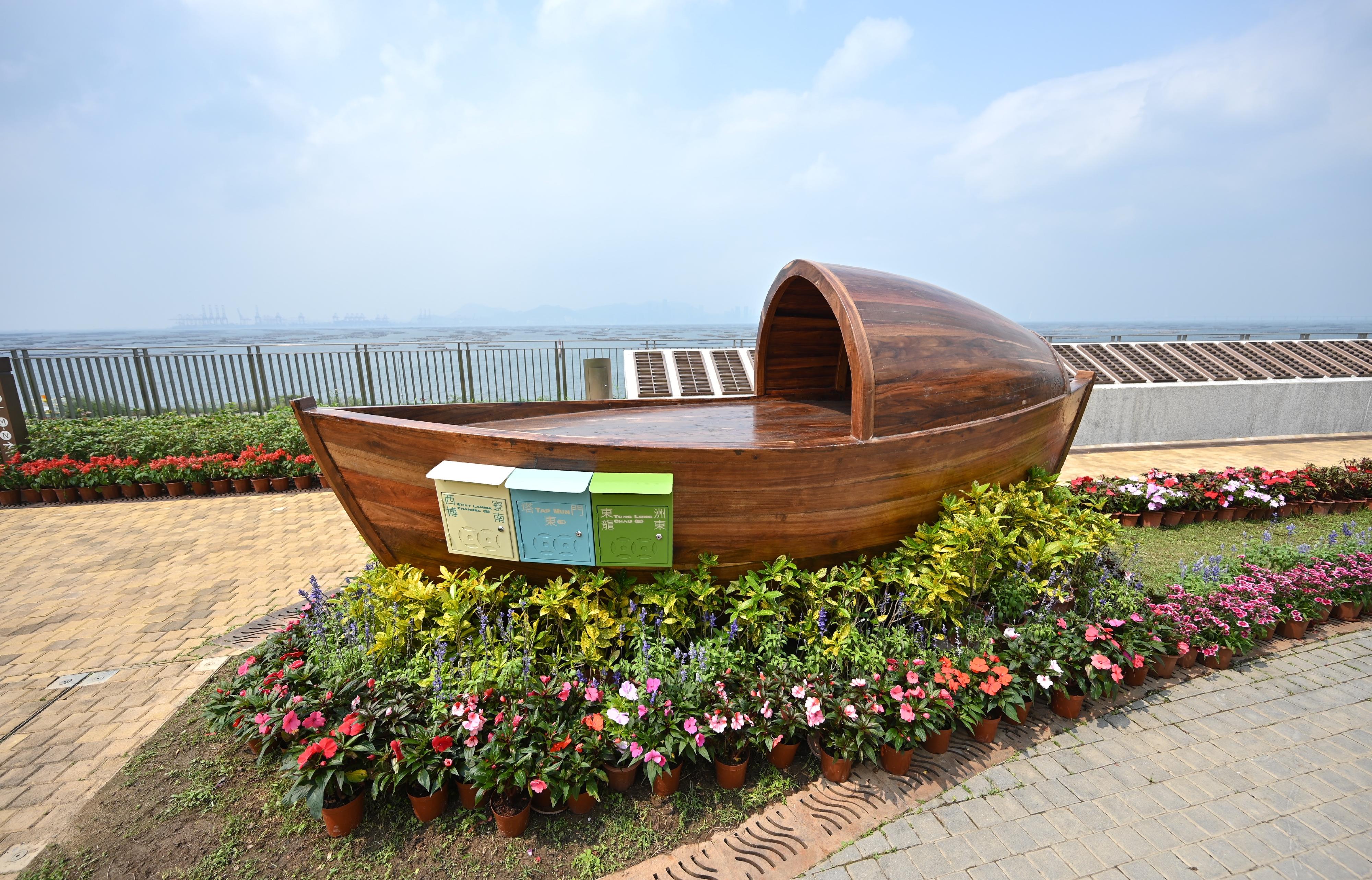 食物環境衞生署今日(四月三日)表示,為進一步提升綠色殯葬服務,屯門曾咀紀念花園已增設名為「渡船」的木刻藝術裝置,船身掛上數個富有香港特色的思念信箱,讓曾使用綠色殯葬服務(包括海上撒灰和紀念花園撒灰)的家屬投遞心意信箋,向先人表達思念與祝福。