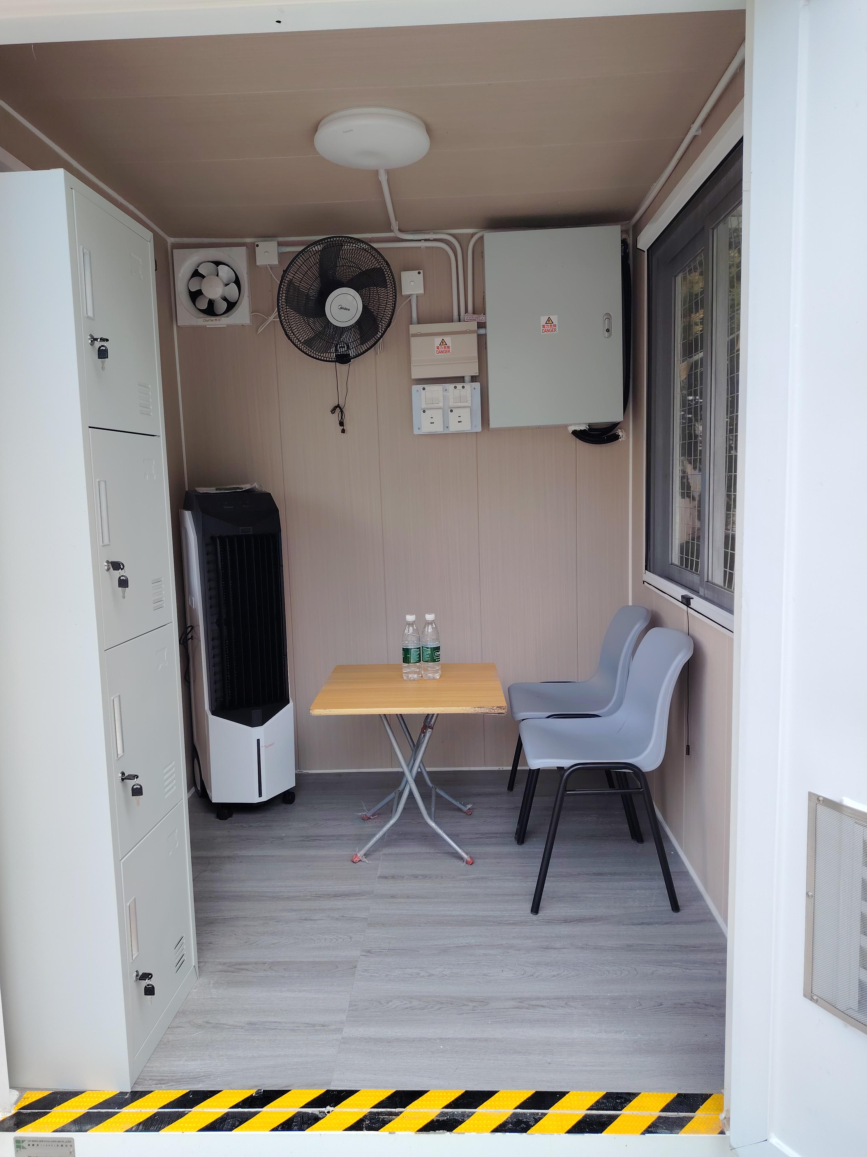 食物環境衞生署(食環署)發言人今日(四月三十日)表示,食環署一向致力為前線清潔工人提供適切的工作及休息環境,除了持續檢視各項基本需求,包括飲用水、短暫休息地方、清潔工具用水和廁所設施等,確保所有前線清潔工人皆獲得所需的安排外,在條件許可下,亦會透過翻新或優化垃圾收集站,盡可能進一步改善員工的工作環境,並提供更方便的員工設施。食環署自二○二三年起已安裝共一百三十三個太陽能清涼休息站,利用太陽能供電予休息站內的設施,包括冷風機、風扇和抽氣扇等。圖為太陽能清涼休息站内的員工便利設施。