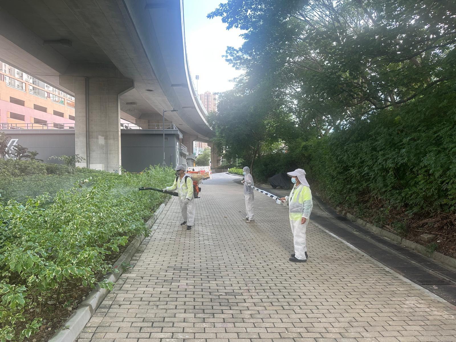 食物環境衞生署(食環署)在葵青區青衣北和屯門區屯門西進行防蚊滅蚊工作。圖示食環署承辦商人員在屯門西以霧化處理方式殺滅成蚊。