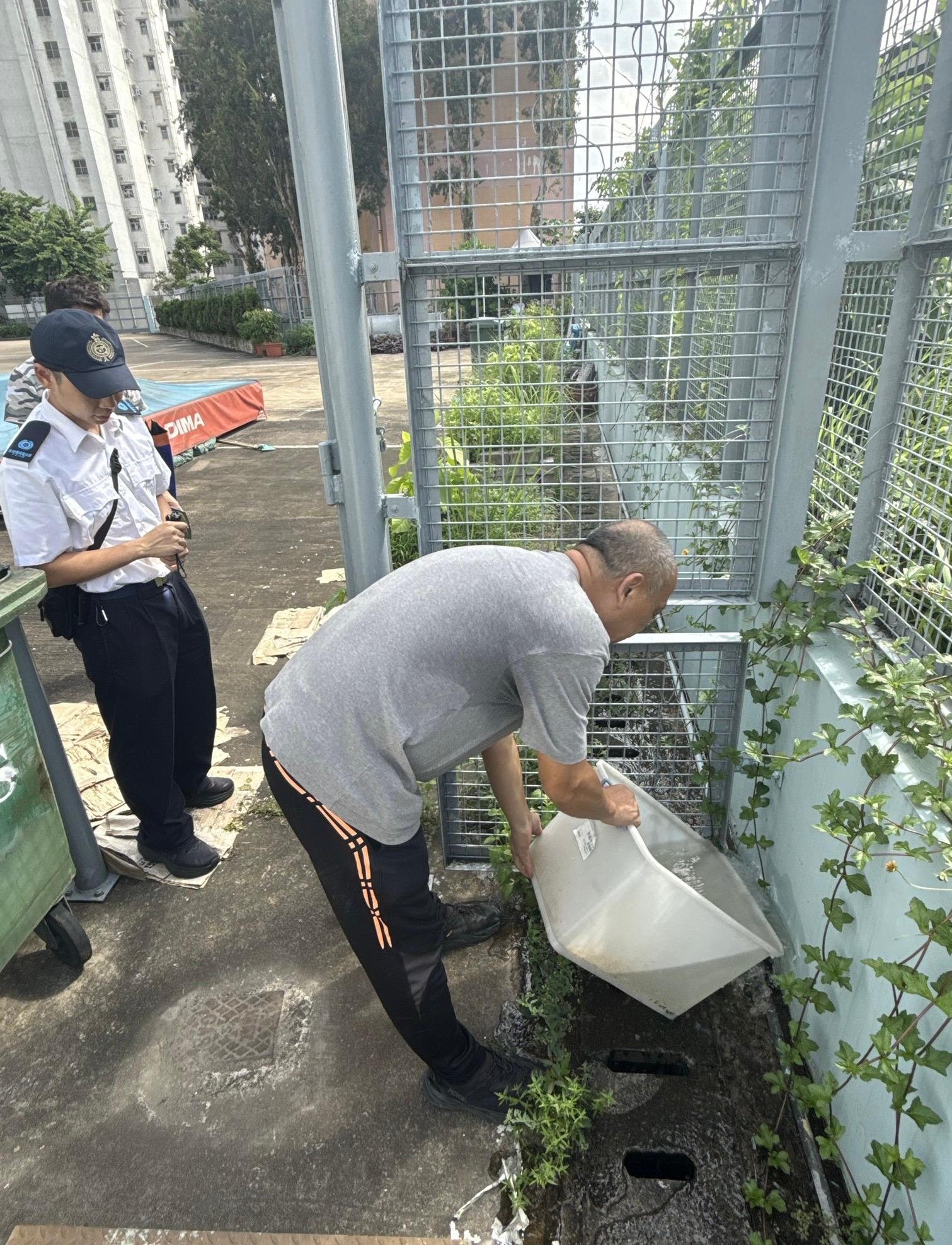 食物環境衞生署(食環署)在葵青區青衣北和屯門區屯門西進行防蚊滅蚊工作。圖示食環署人員巡視屯門西一學校,找出蚊子潛在滋生地,並向校方人員給予相關建議和技術支援,藉此提高防控蚊子的成效。