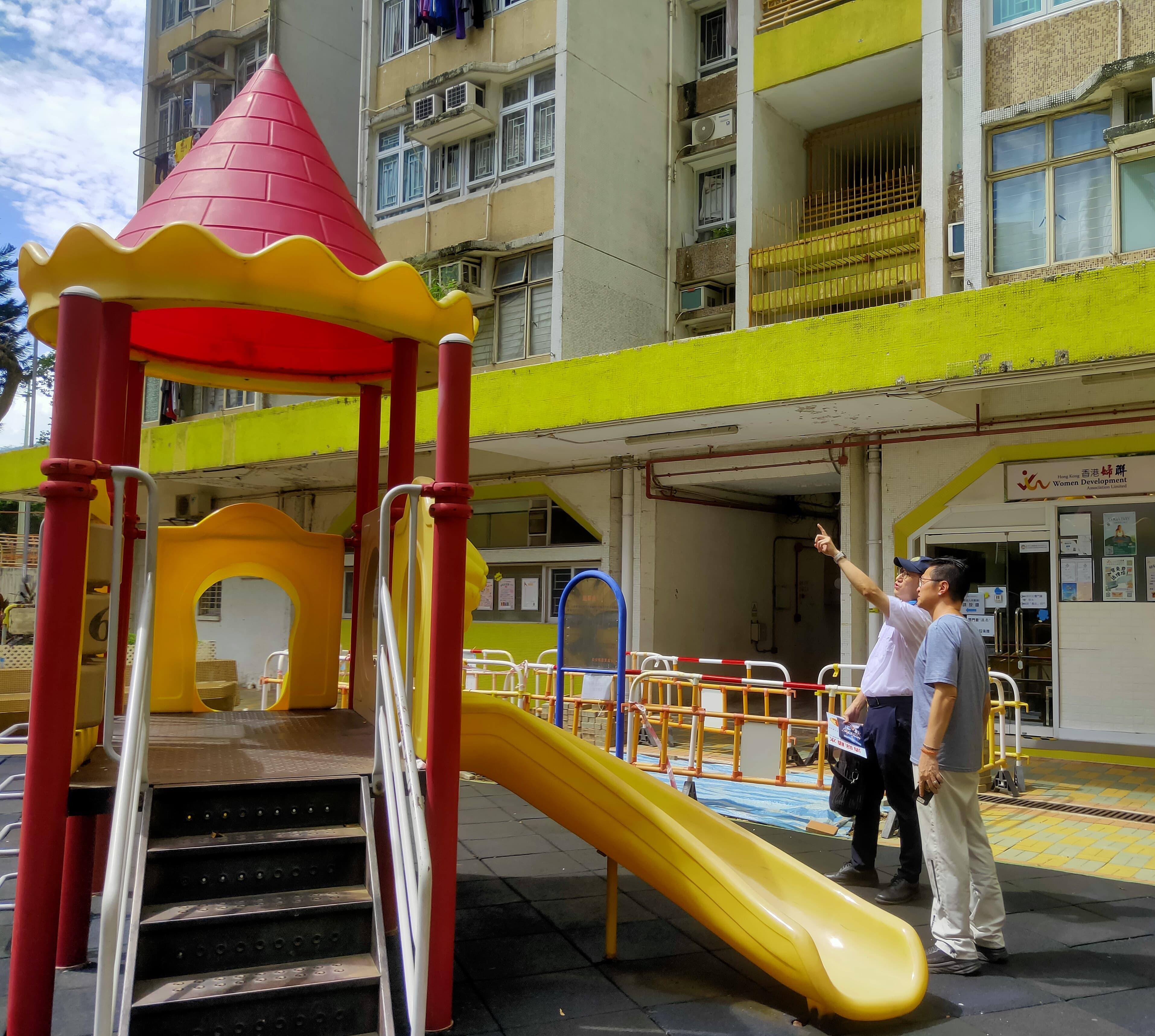 食物環境衞生署(食環署)在葵青區青衣北和屯門區屯門西進行防蚊滅蚊工作。圖示食環署人員向一名物業管理人員提供控蚊建議。