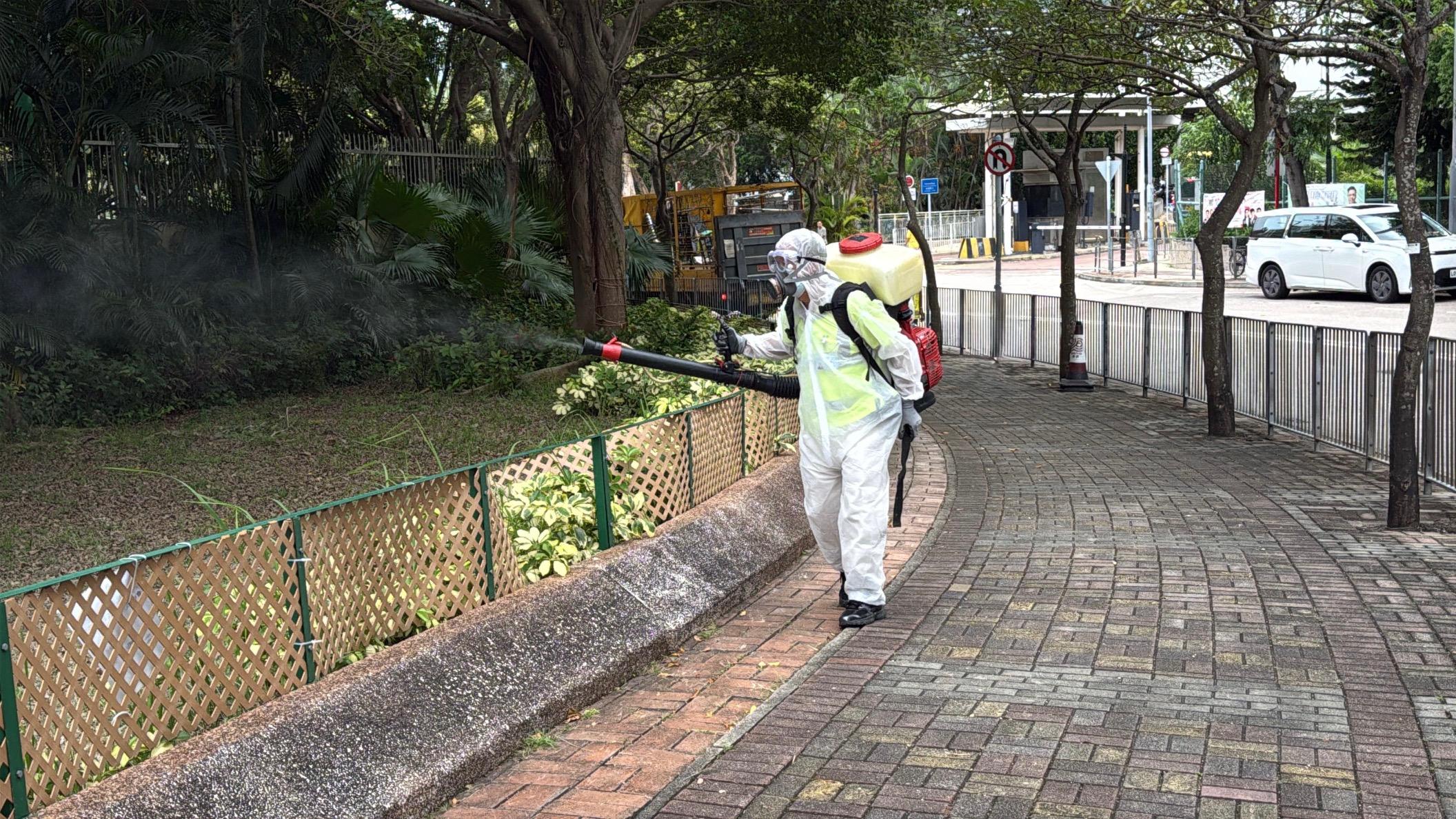 食物環境衞生署(食環署)今日(八月二十六日)公布八月份第八批涵蓋13個監察地區的白紋伊蚊誘蚊器指數及密度指數。圖示食環署承辦商人員在深水埗區長沙灣以霧化處理方式殺滅成蚊。