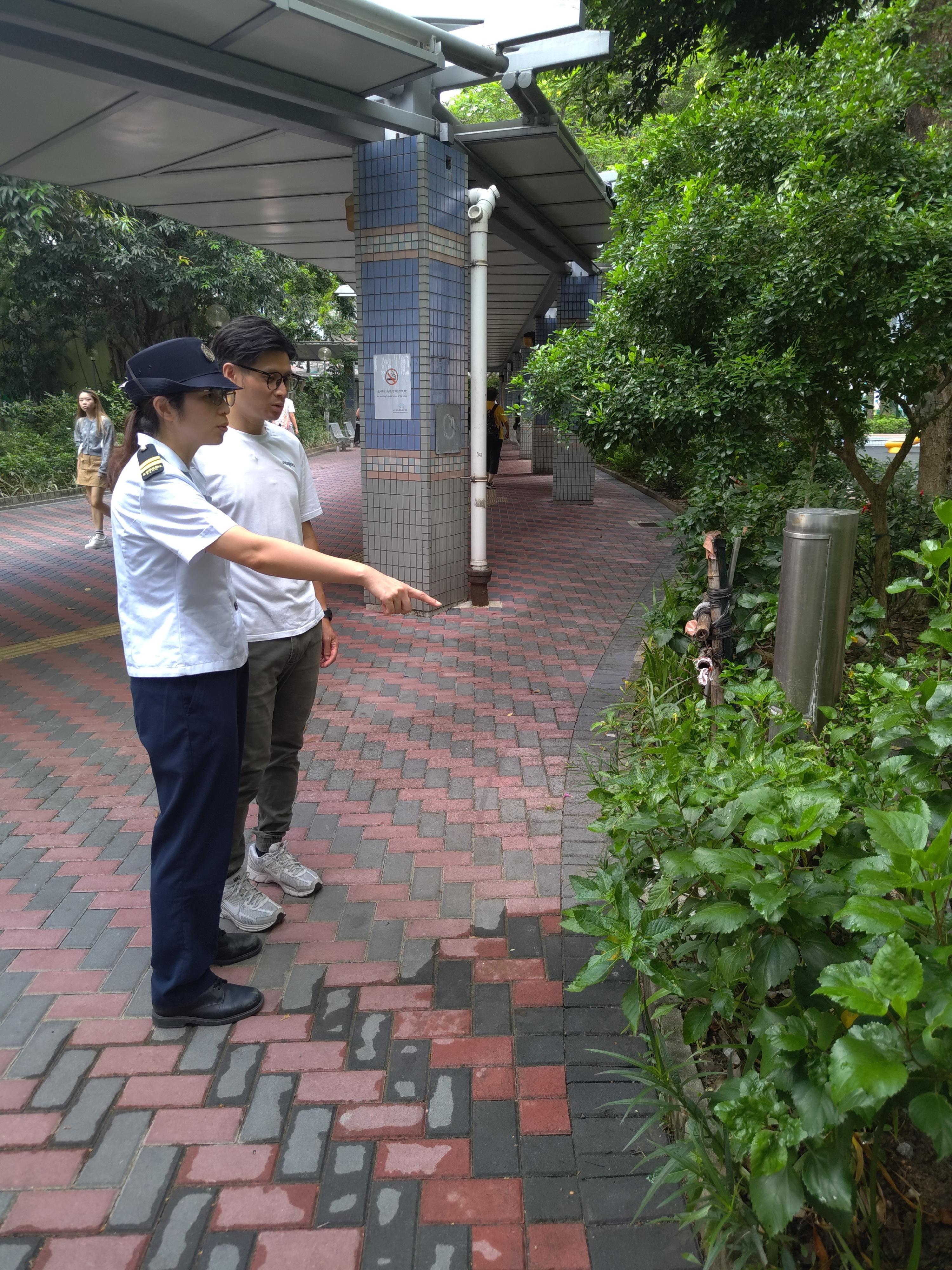 食物環境衞生署(食環署)今日(八月二十六日)公布八月份第八批涵蓋十三個監察地區的白紋伊蚊誘蚊器指數及密度指數。圖示食環署人員巡視深水埗區長沙灣的公共屋邨,提醒物業管理人員加強防控蚊患工作。