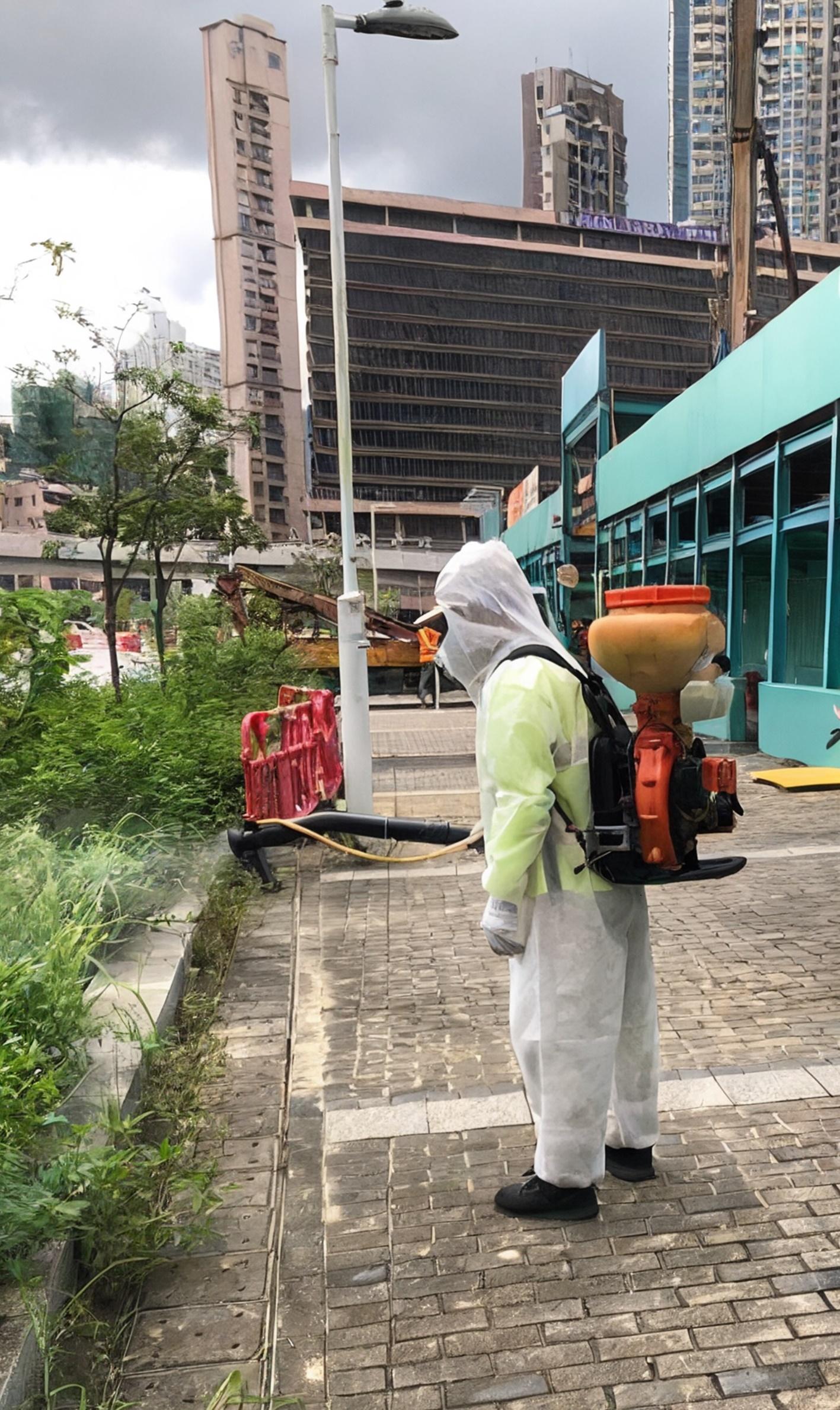 食物環境衞生署(食環署)今日(八月二十八日)公布八月份第九批涵蓋17個監察地區的白紋伊蚊誘蚊器指數及密度指數。圖示一名食環署承辦商人員在九龍城區啟德北以霧化處理方式殺滅成蚊。