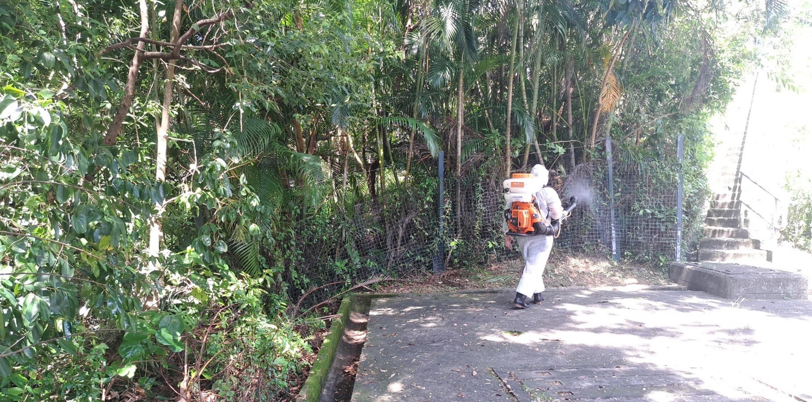 食物環境衞生署(食環署)今日(八月二十八日)公布八月份第九批涵蓋17個監察地區的白紋伊蚊誘蚊器指數及密度指數。圖示一名食環署承辦商人員在荃灣區馬灣以霧化處理方式殺滅成蚊。