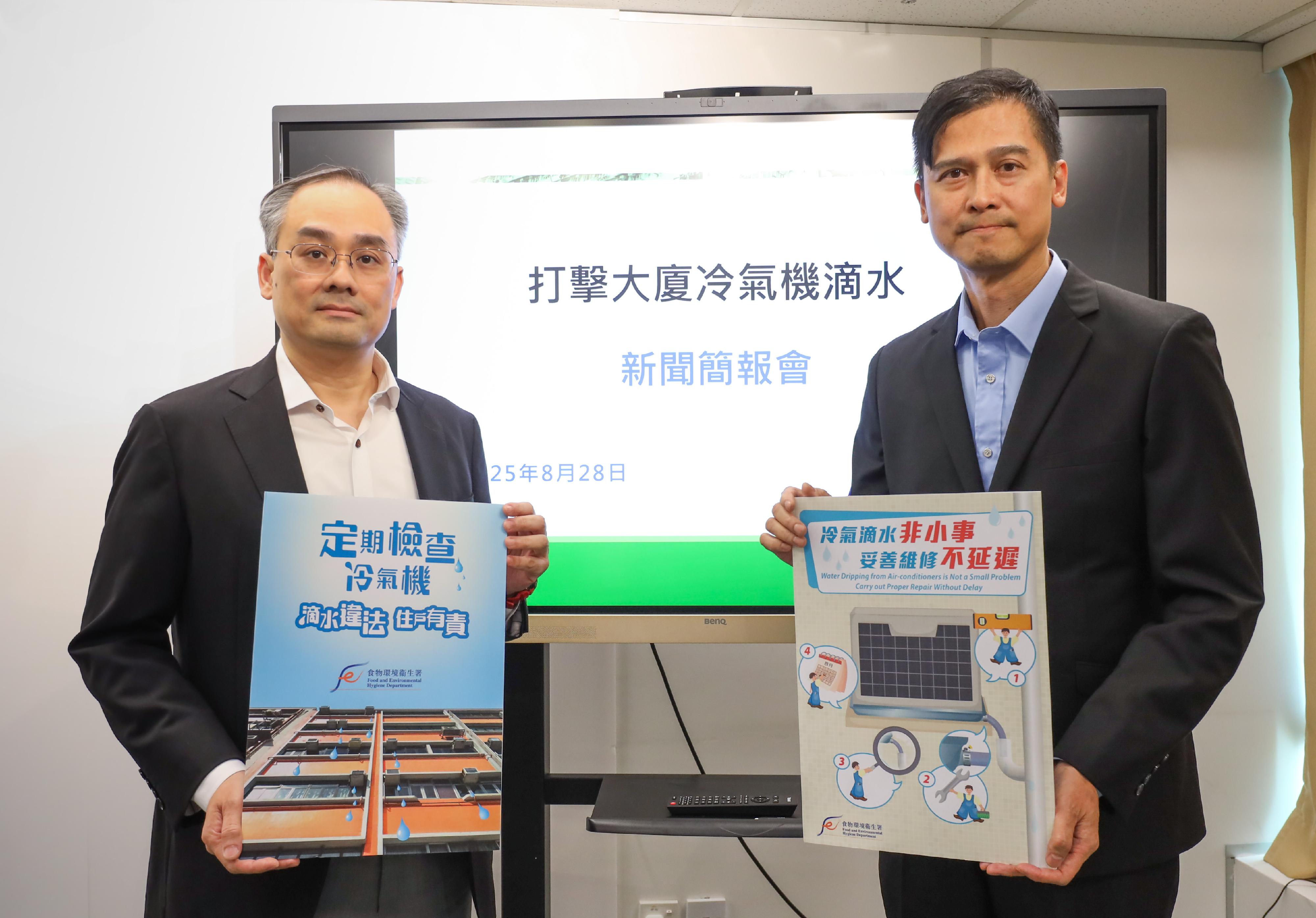 食物環境衞生署(食環署)今日(八月二十八日)舉行傳媒簡報會,介紹針對冷氣機滴水問題的全新執法模式。圖示食環署助理署長(行動)溫智舜(左)和食環署油尖區環境衞生總監陳家俊(右)主持傳媒簡報會。