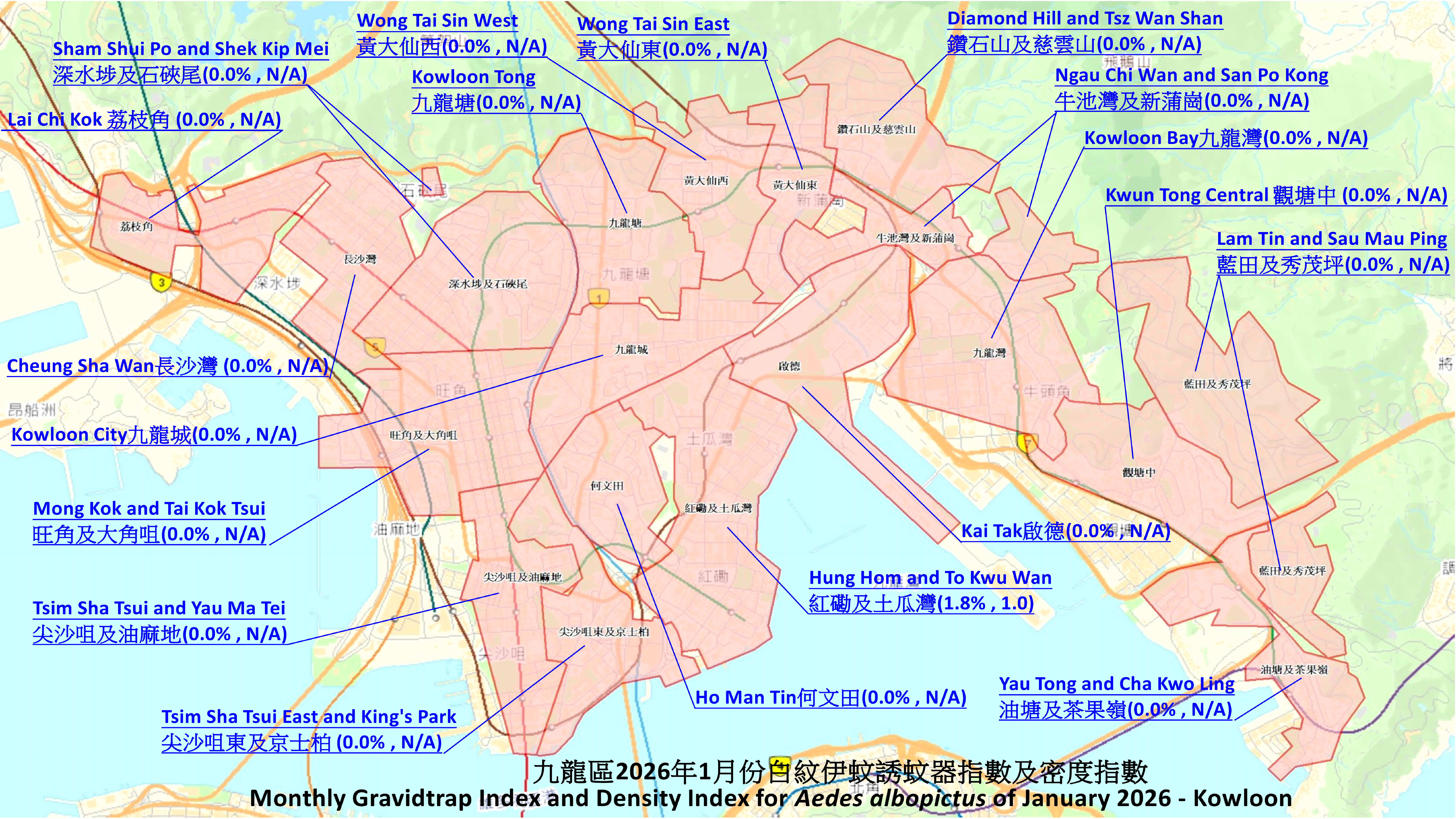 | 旺角區 | 旺角及大角咀 | 分區誘蚊器指數 | 0.0 | |||||||||||