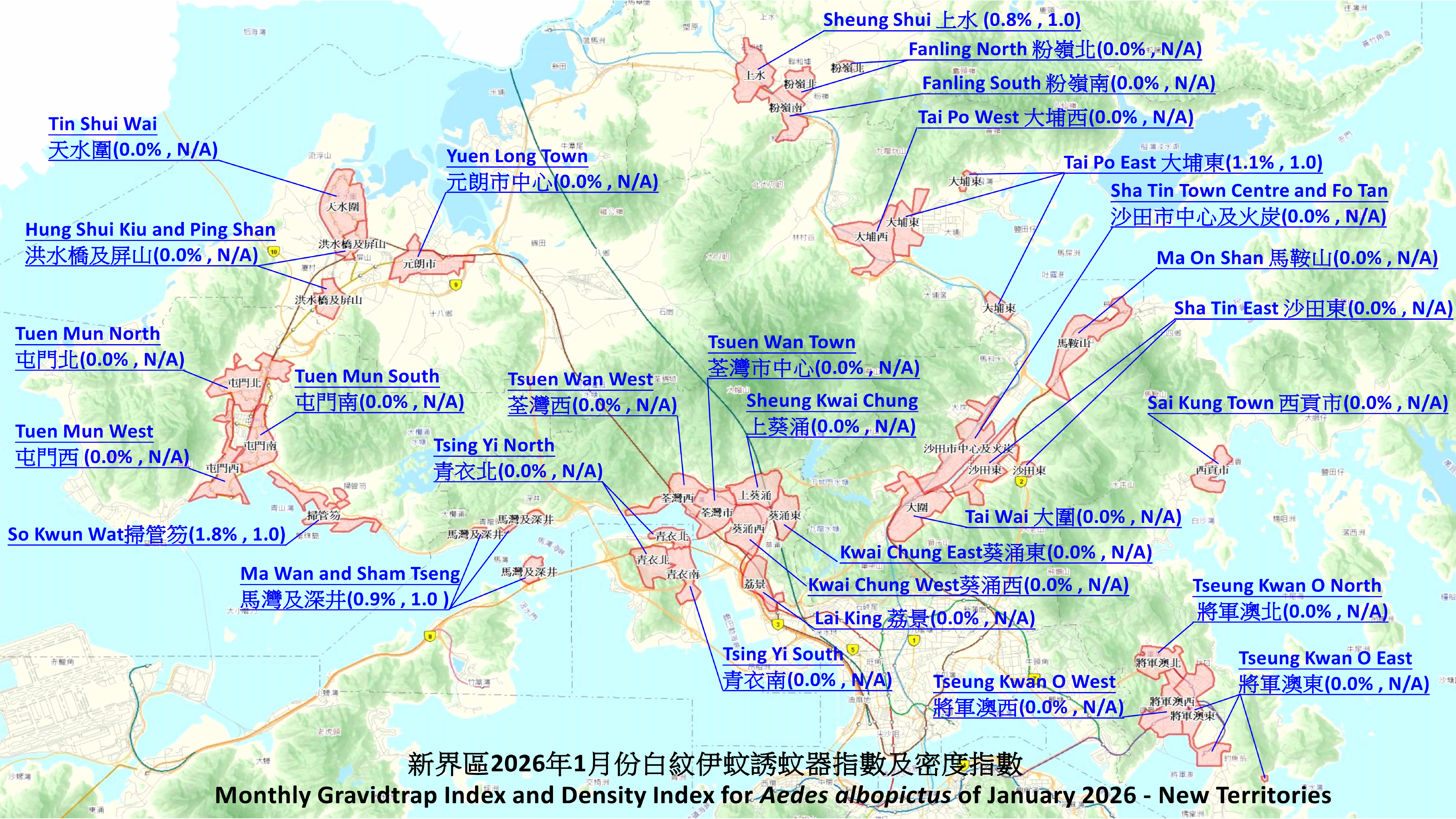 | 荃灣市中心 | 分區誘蚊器指數 | 0.0 | ||||||||||||