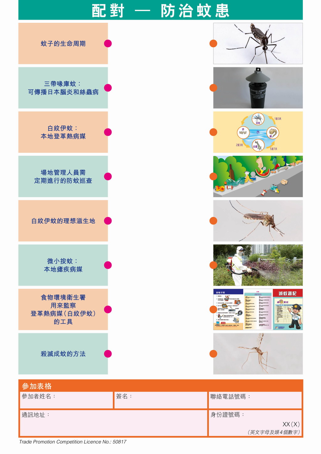 「配對 – 防治蚊患」有獎遊戲已於2018年10月30日圓滿結束。得獎名單已於2018年11月9日在星島日報和英文虎報公布。遊戲答案可以按