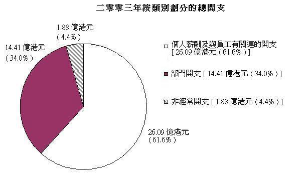 二零零三年,本署的開支合共42.38億元,其中26.09億元用以支付員工薪酬及津貼和與員工有關連的開支,14.41億元用於部門開支,1.88億元則用以支付非經常開支。
