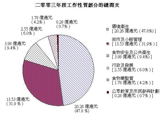 以工作性質分類,大部分開支用於提供環境衞生服務(20.26億元),其餘依次為街市及小販管理(13.53億元)、食物安全及公共衞生(3.98億元)、行政及發展(2.55億元)、食物業監管(1.78億元),以及公眾教育和市民參與計劃(2 800萬元)。