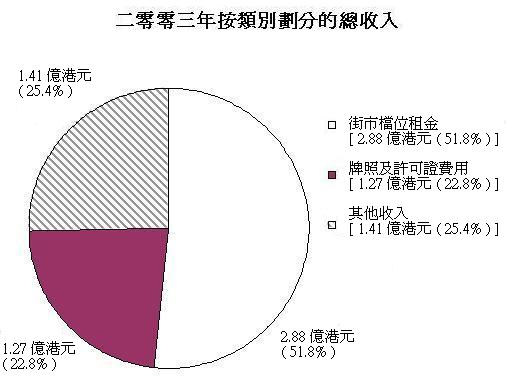 本署二零零三年的收入為5.56億元,其中大部分來自本署轄下街市約12,000個檔位的租金(2.88億元),以及簽發牌照和許可證的收費(1.27億元)。其他收入來源包括墳場和火葬場服務費(6,400萬元)、肉類檢驗費(2,900萬元),以及其他雜項服務收費(4,800萬元)。